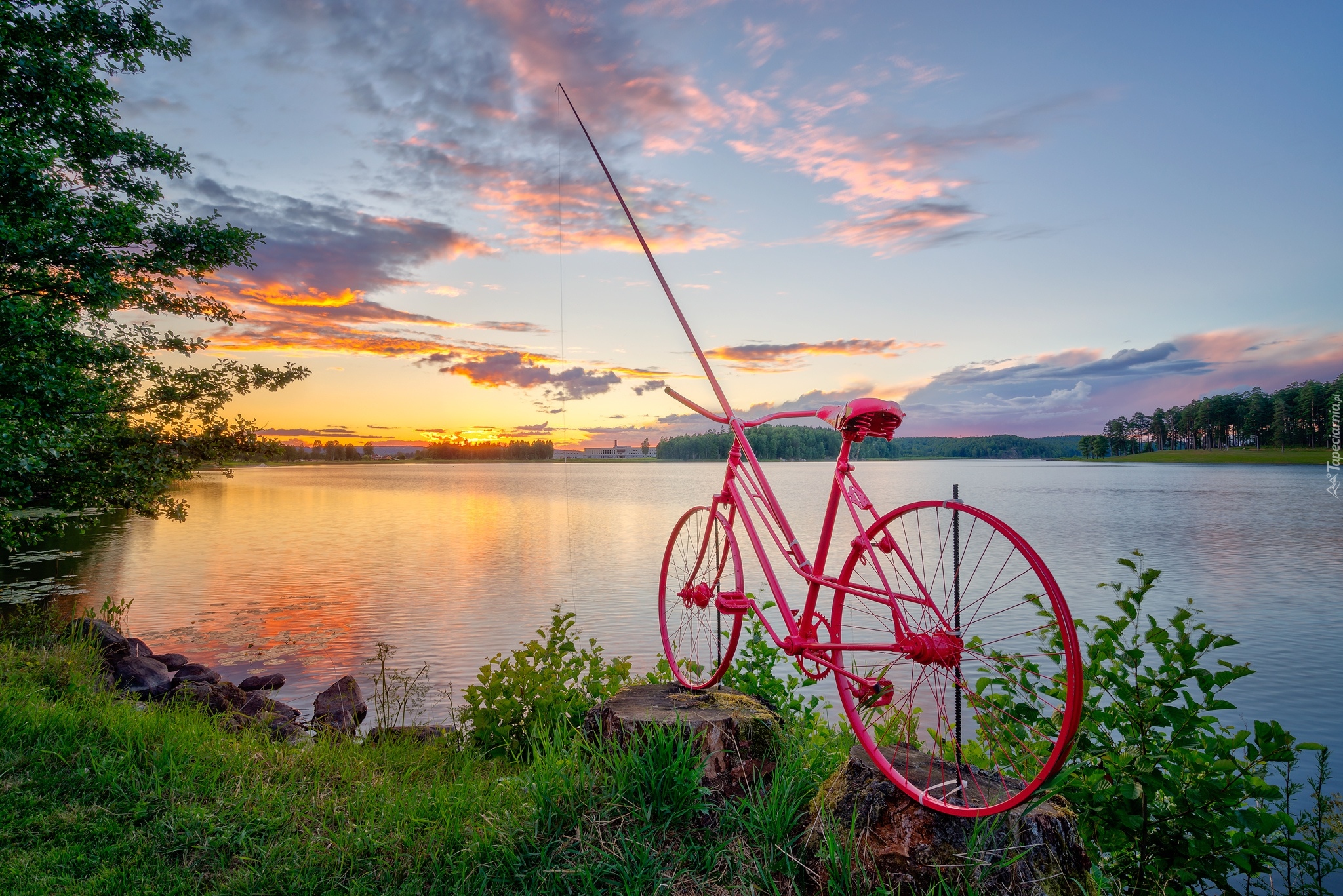 Edytor tapety: Rower z wędką nad jeziorem