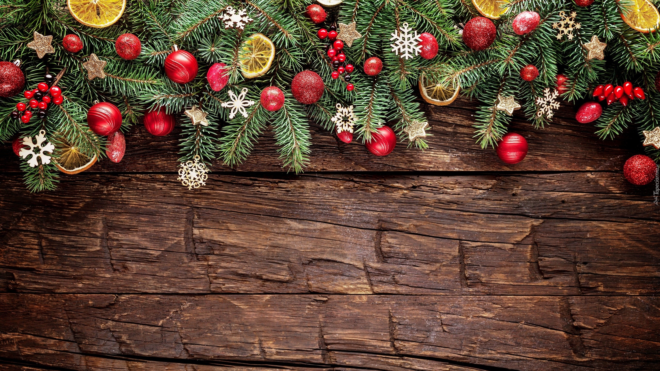 Edytor tapety: Gałązki świerkowe ozdobione bombkami i śnieżynkami