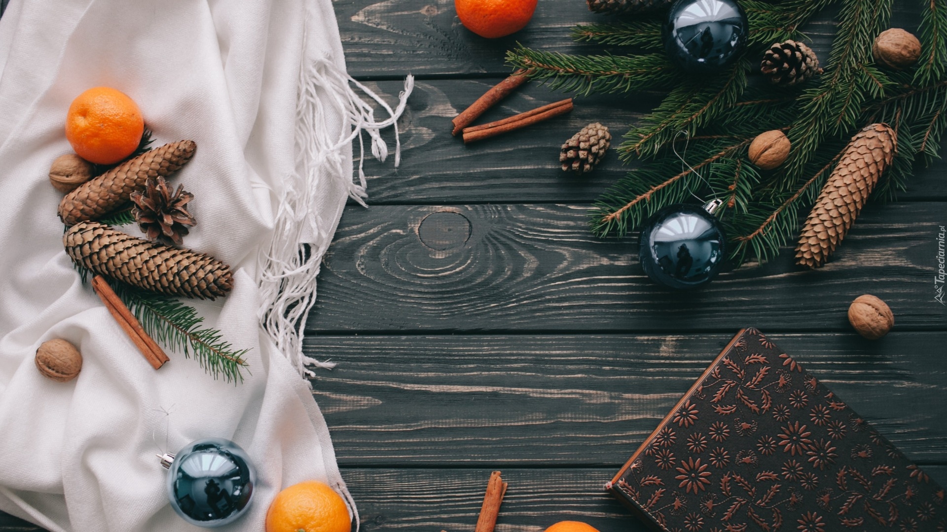 Edytor tapety: Szyszki i bombki na gałązkach i szaliku