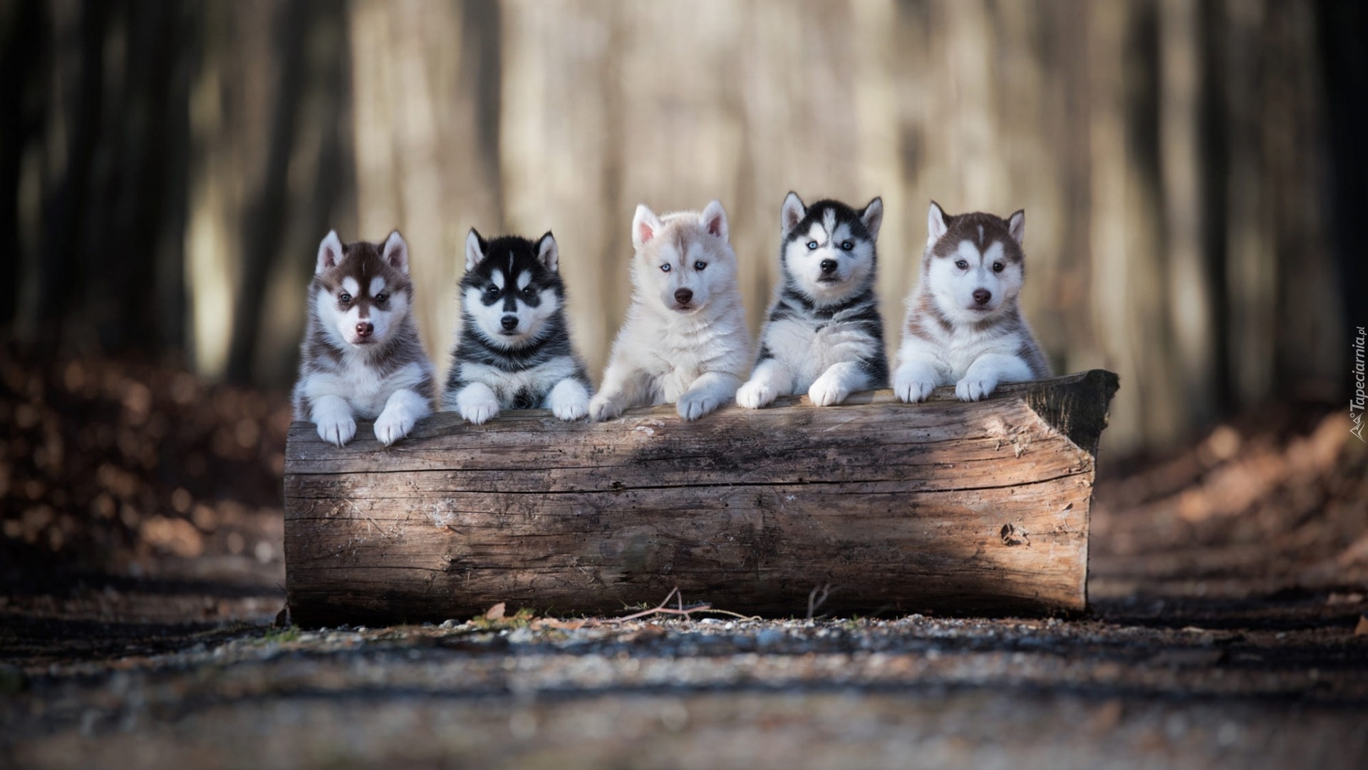 Edytor tapety: Pięć szczeniaków siberian husky