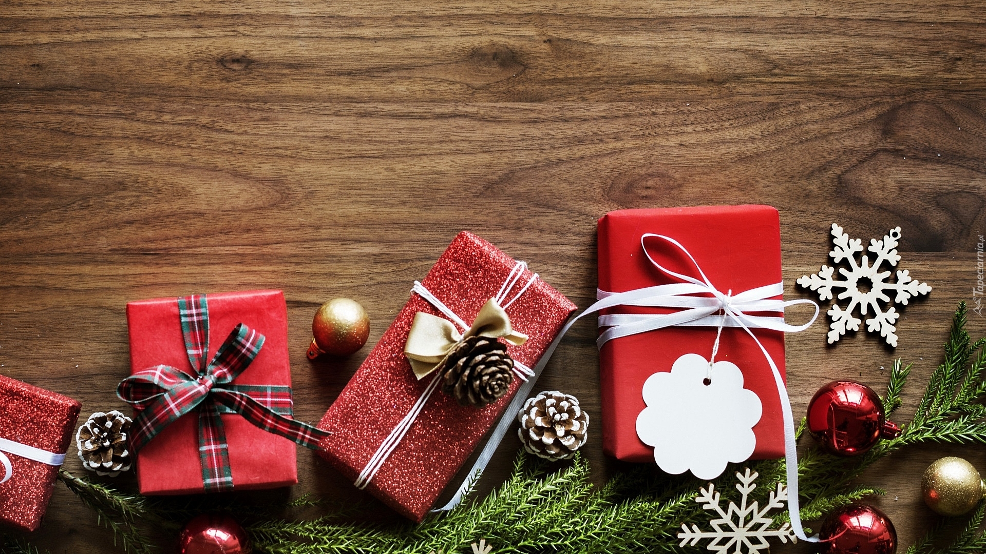 Edytor tapety: Prezenty świąteczne i bombki na deskach
