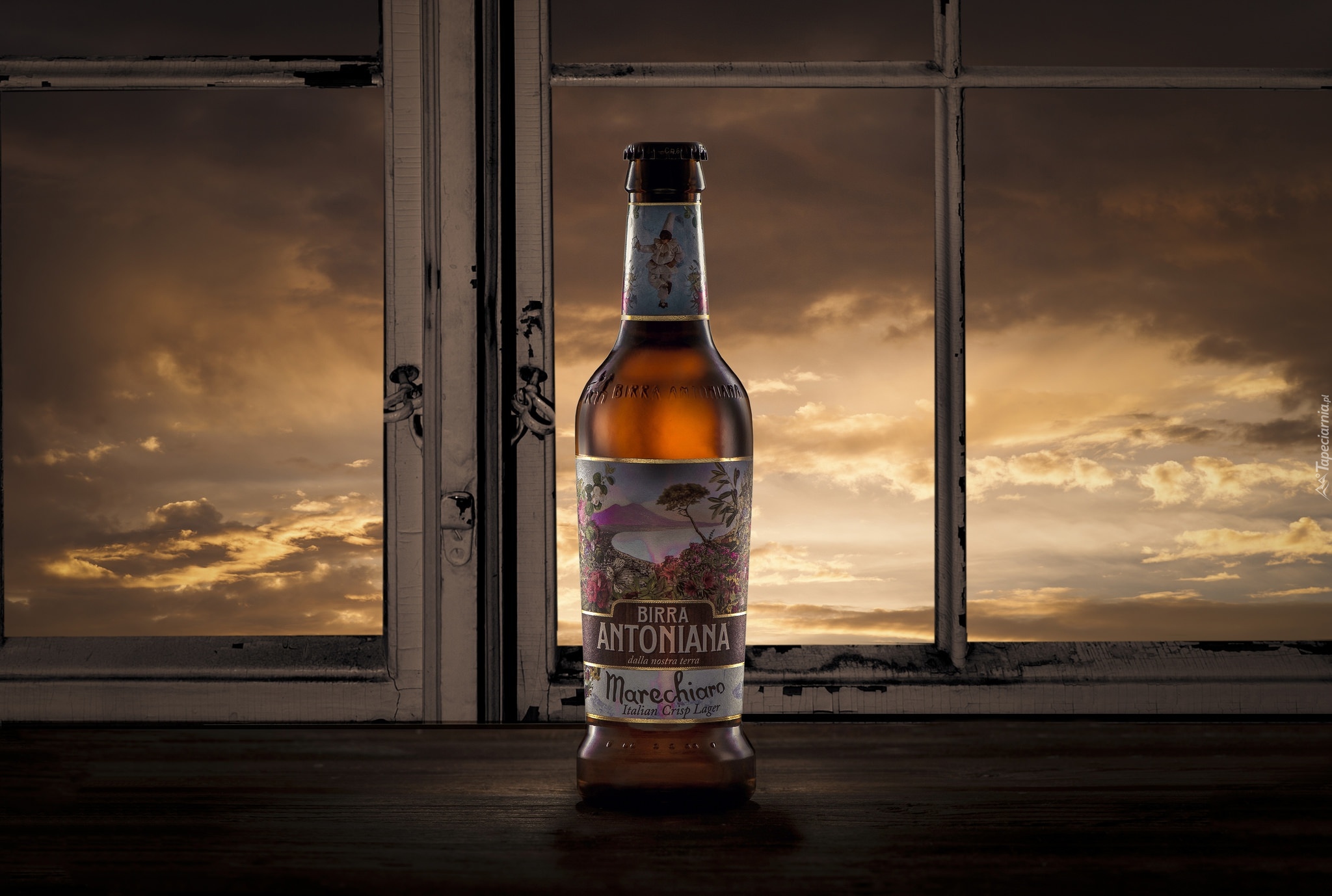 Edytor tapety: Butelka piwa postawiona na parapecie
