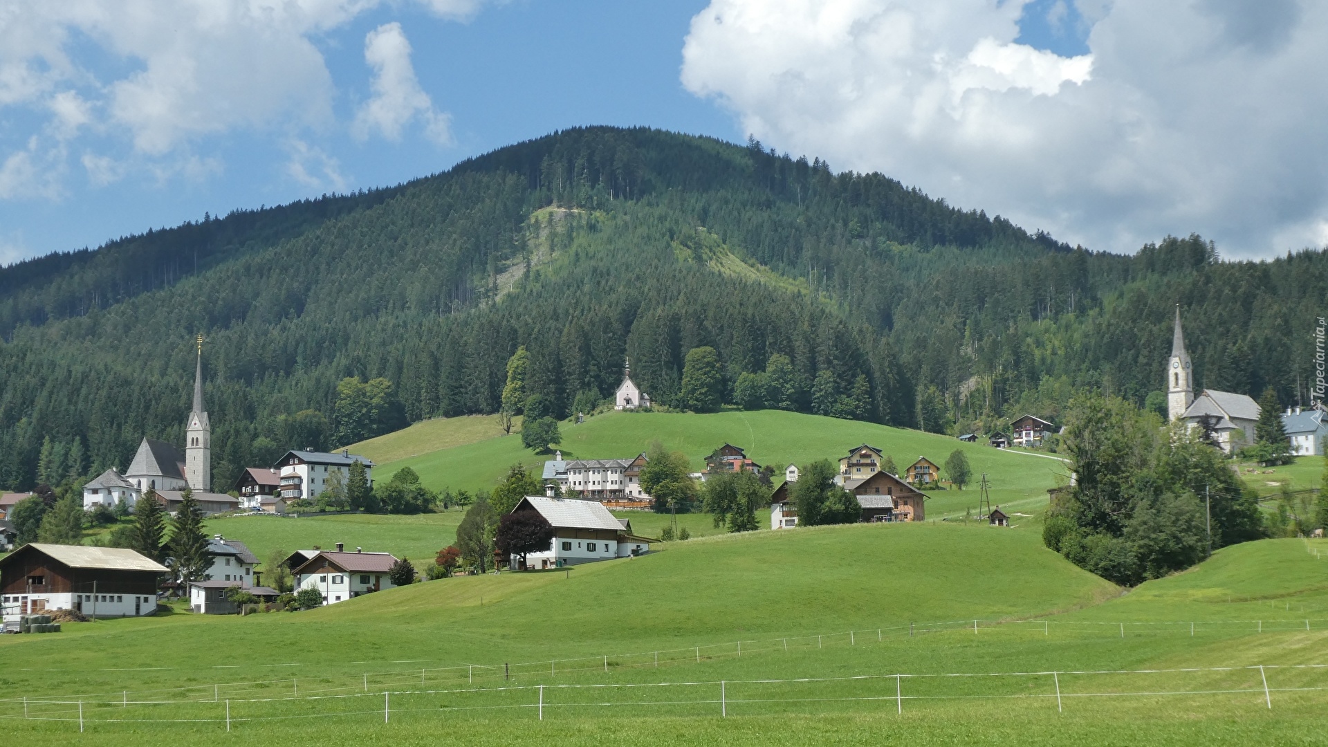 Edytor tapety: Domy i kościoły na tle wzgórza w Gosau