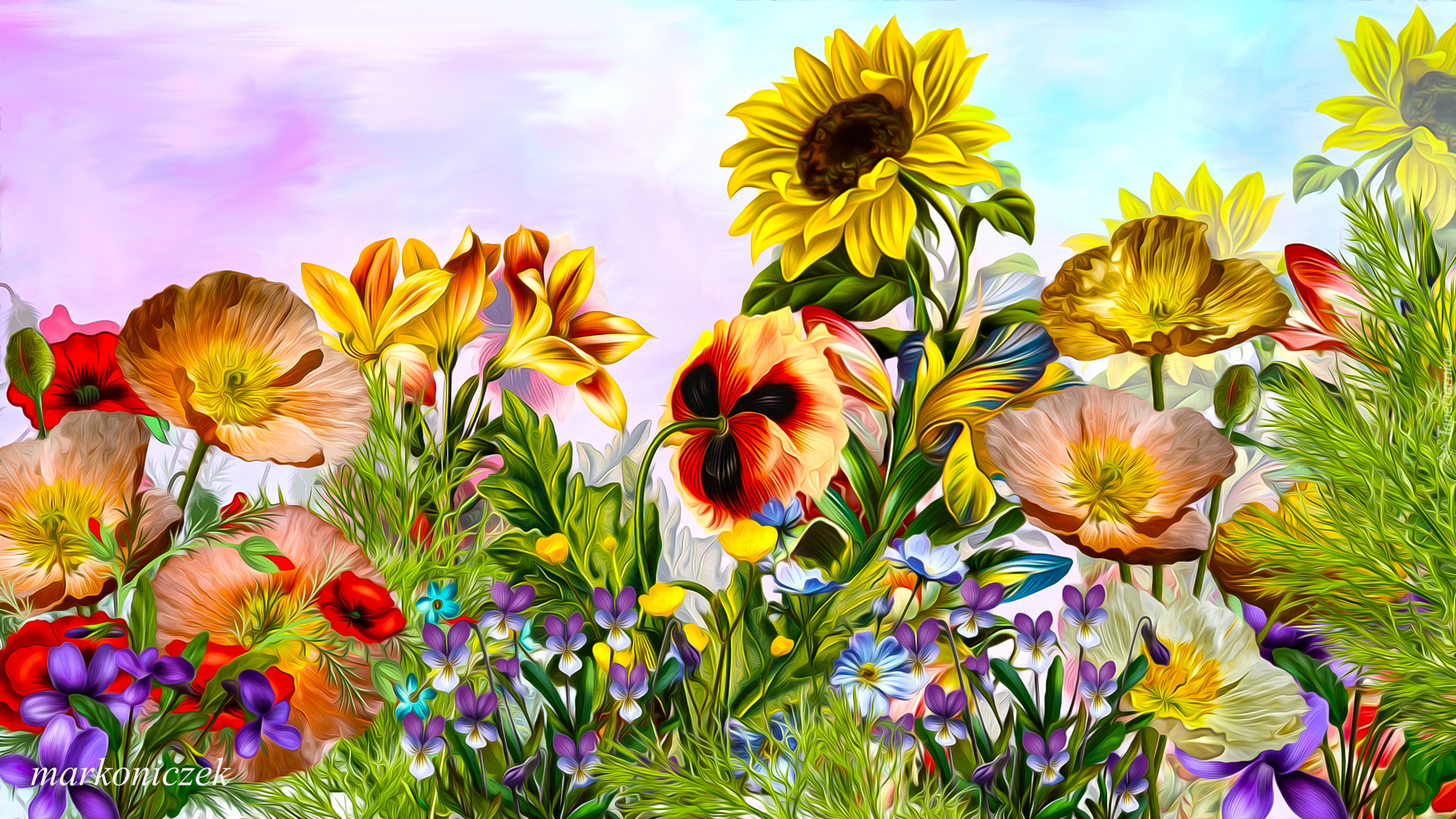 Edytor tapety: Słonecznik i lilie pośród maków