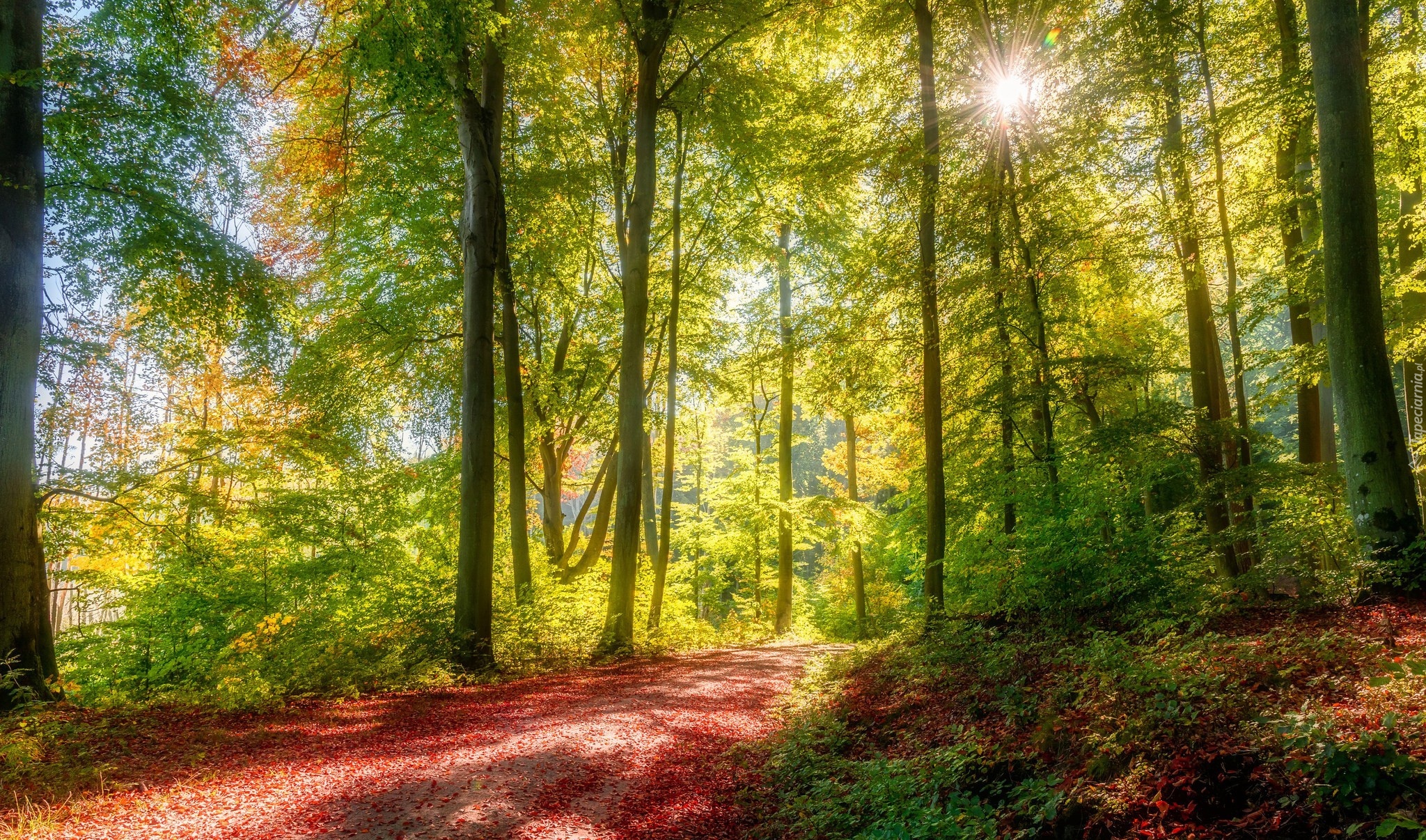 Edytor tapety: Promyki słońca padające na drogę w lesie