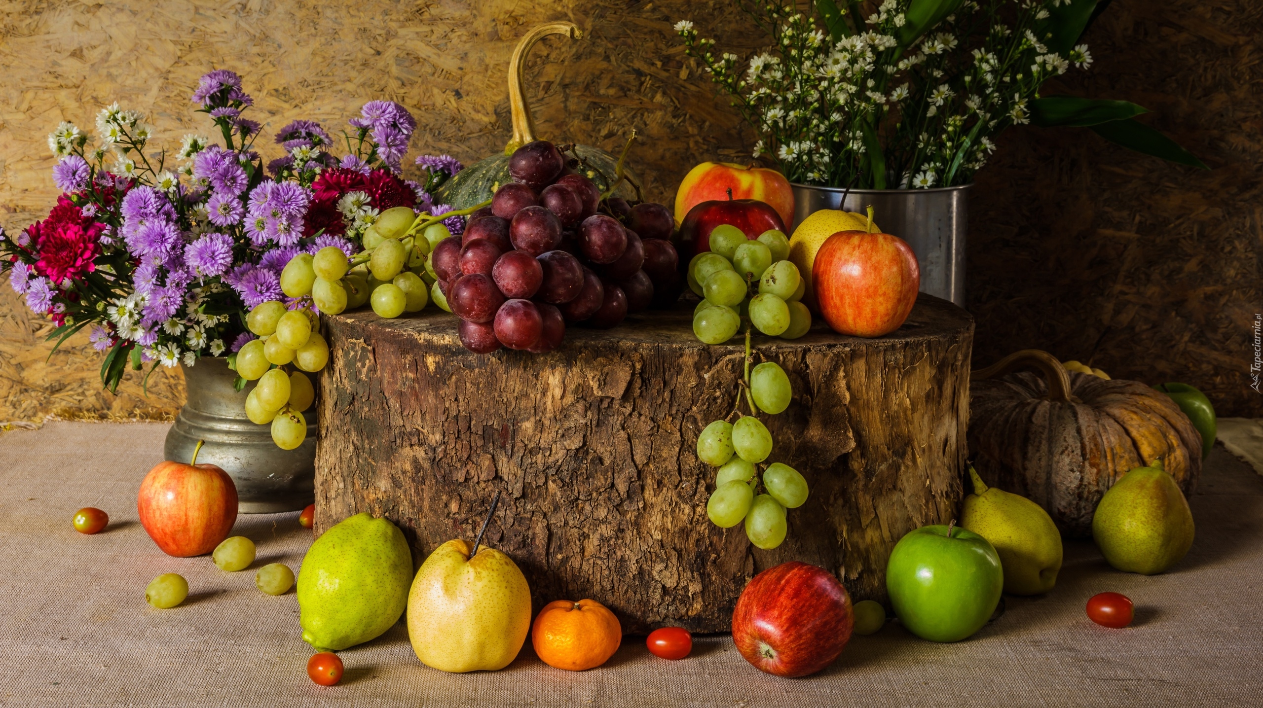 Edytor tapety: Owoce na klocku drewna obok bukietów kwiatów