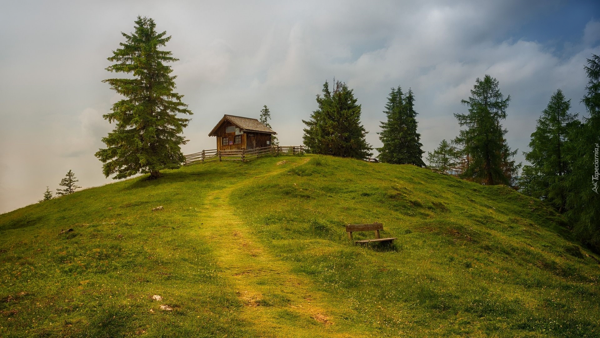Edytor tapety: Dom na wzgórzu otoczony drzewami