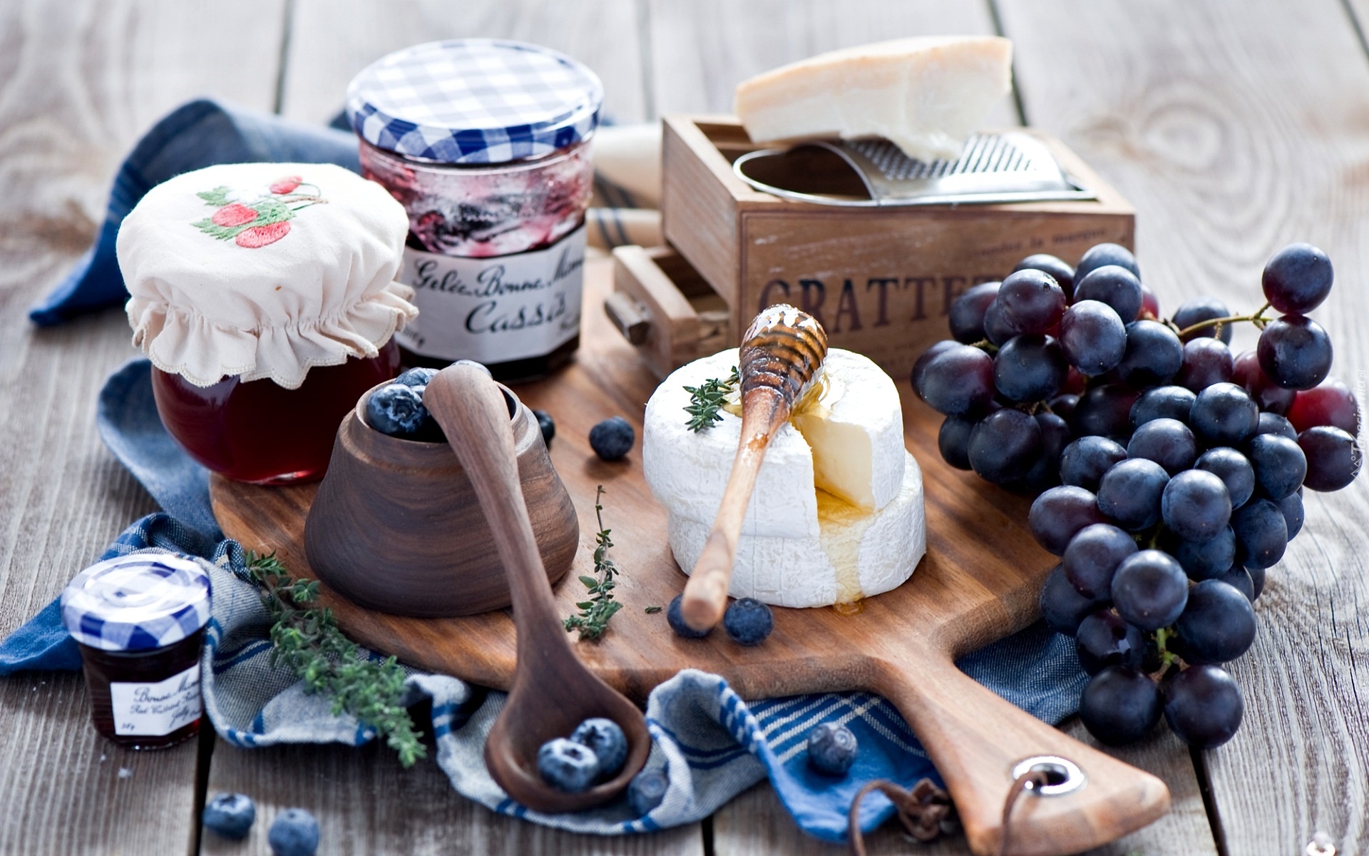 Edytor tapety: Sery obok winogron i słoików na desce