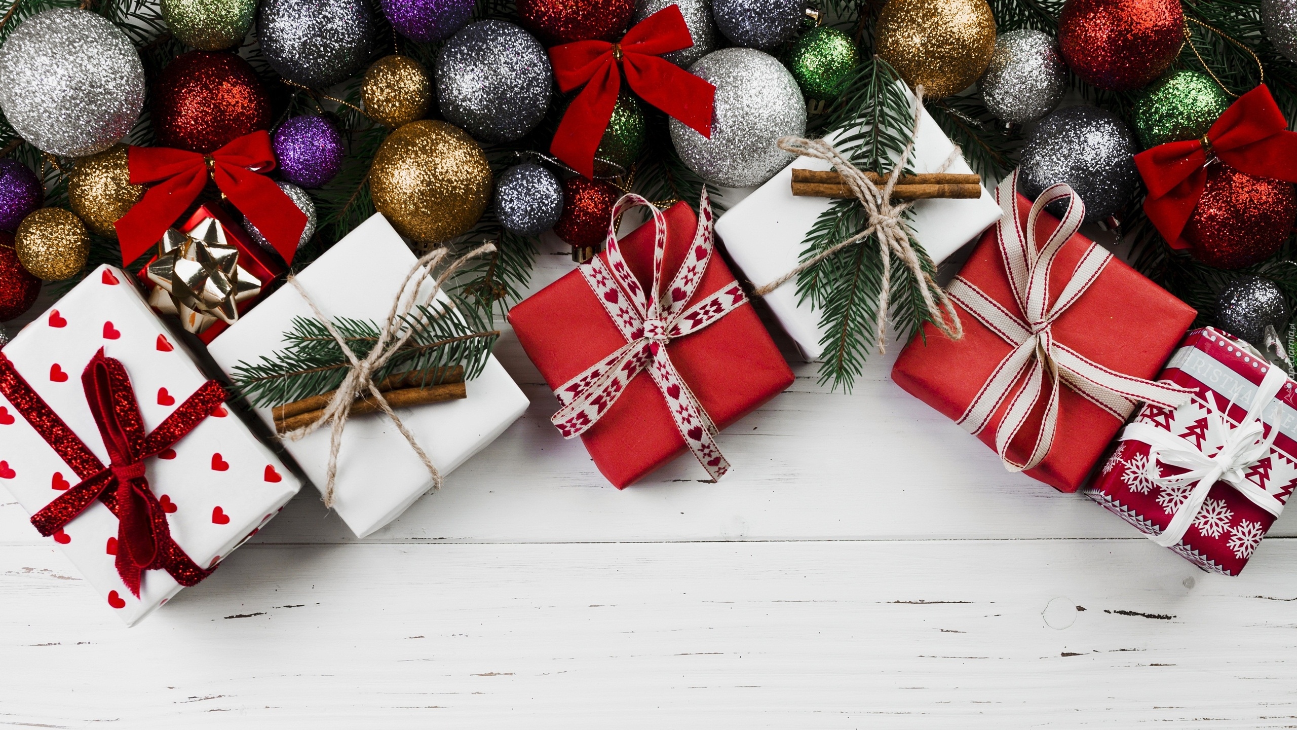 Edytor tapety: Świąteczne prezenty ułożone przy bombkach