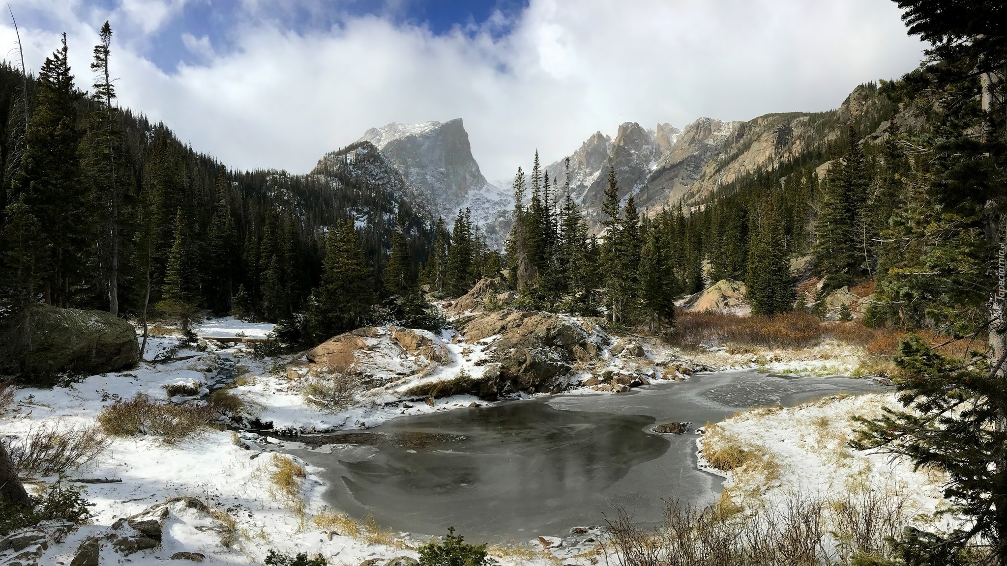 Edytor tapety: Śnieg na skałach obok rzeki na tle gór