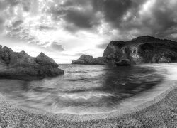 Edytor tapety: Skały w morzu pod ciemnymi chmurami