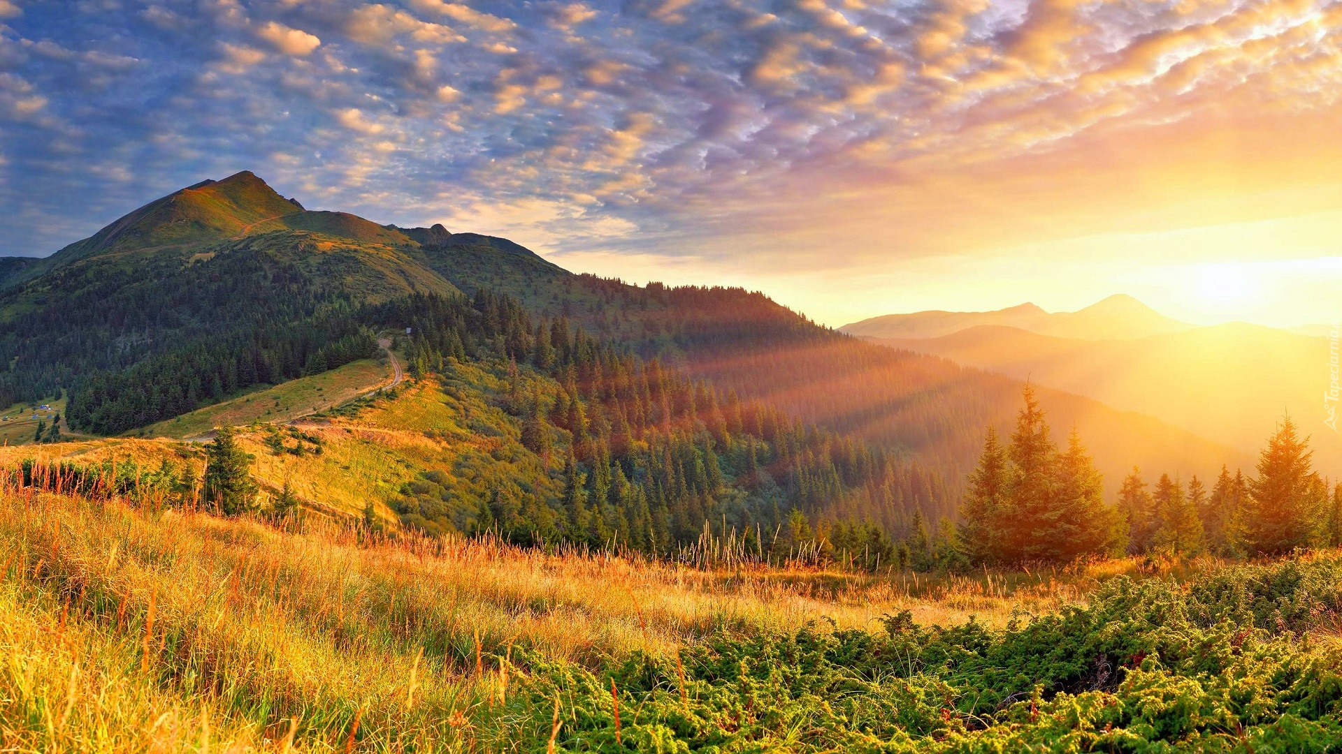 Edytor tapety: Góry i lasy o wschodzie słońca