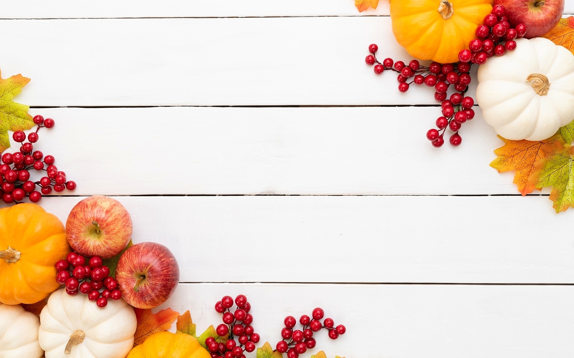 Edytor tapety: Białe i żółte dynie obok czerwonych jagód