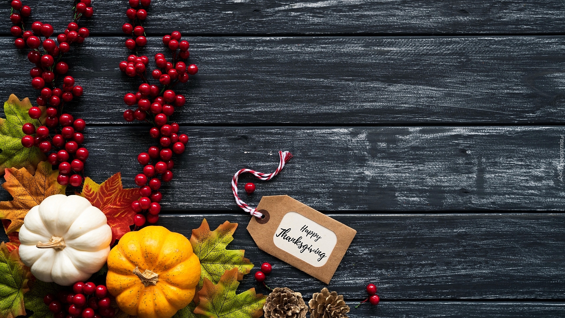 Edytor tapety: Napis Happy Thanksgiving na bileciku obok dyń