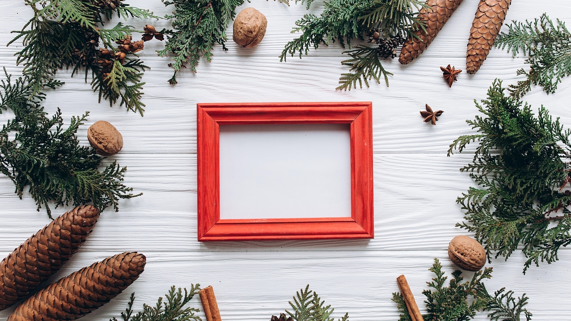 Edytor tapety: Szyszki i gałązki dookoła czerwonej ramki