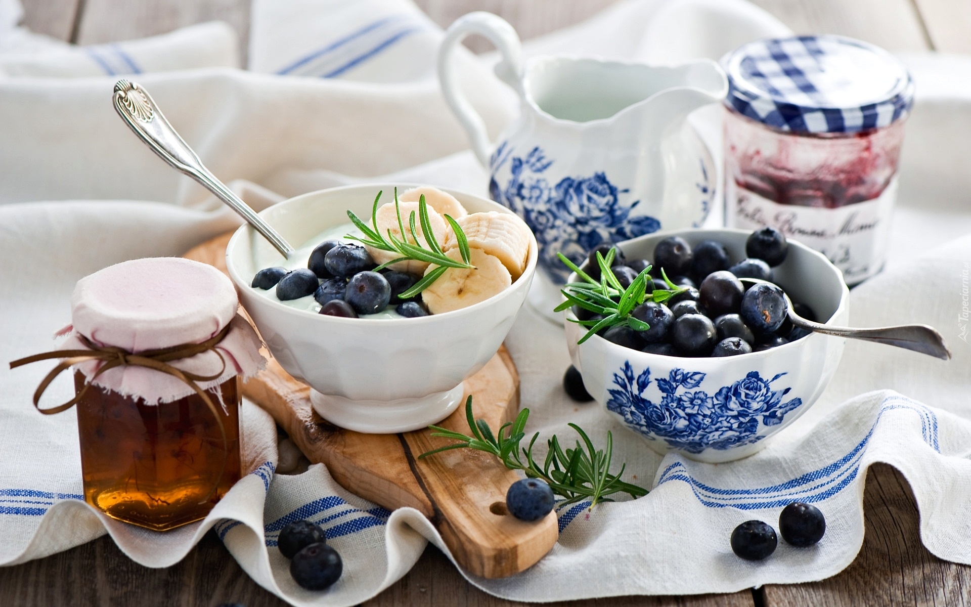 Edytor tapety: Jagody i banany w miseczkach obok miodu