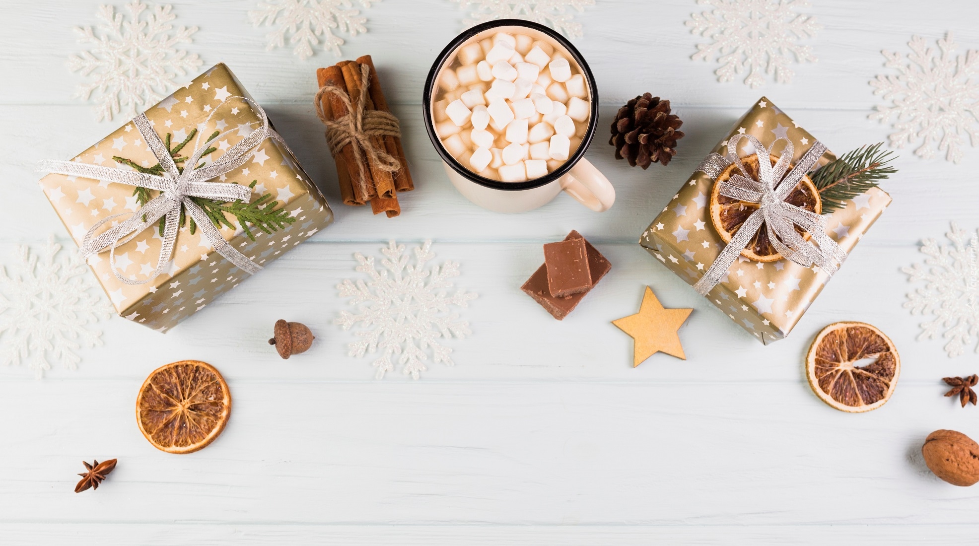 Edytor tapety: Prezenty obok kubka z gorącą czekoladą