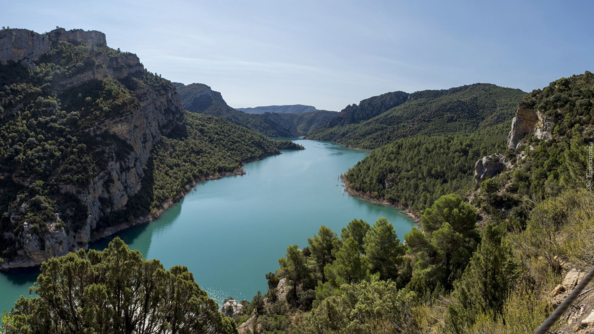 Edytor tapety: Wzgórza i góry porośnięte drzewami nad rzeką