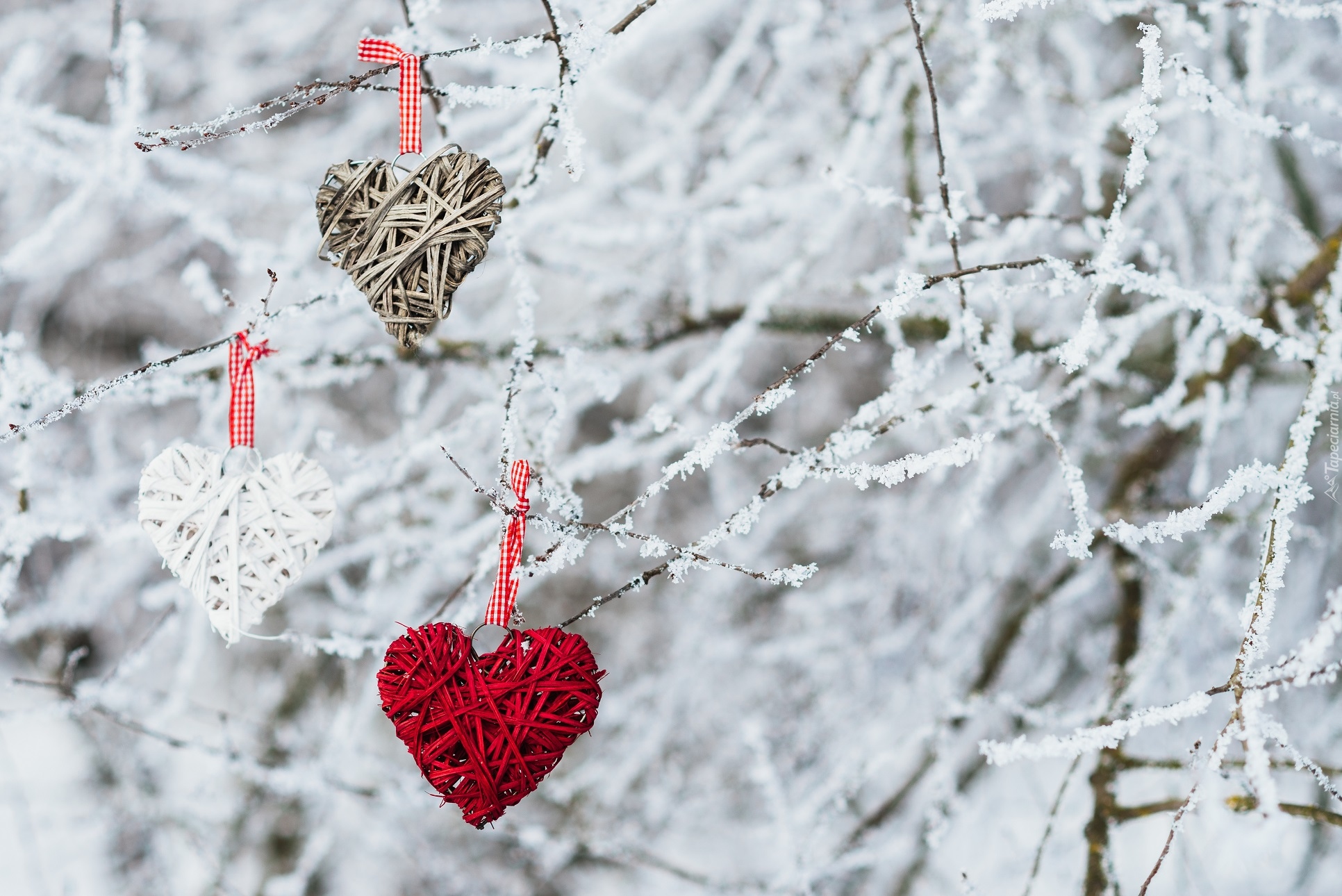 Edytor tapety: Serduszka zawieszone na oszronionych gałązkach