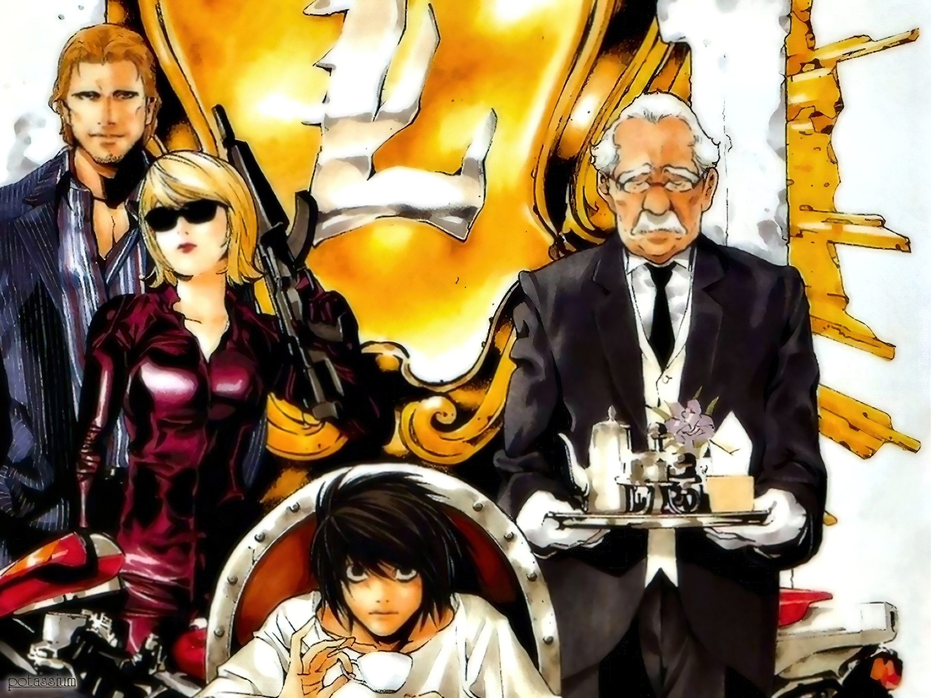 Edytor tapety: Death Note, kelner, taca, pistolet, tron, ludzie