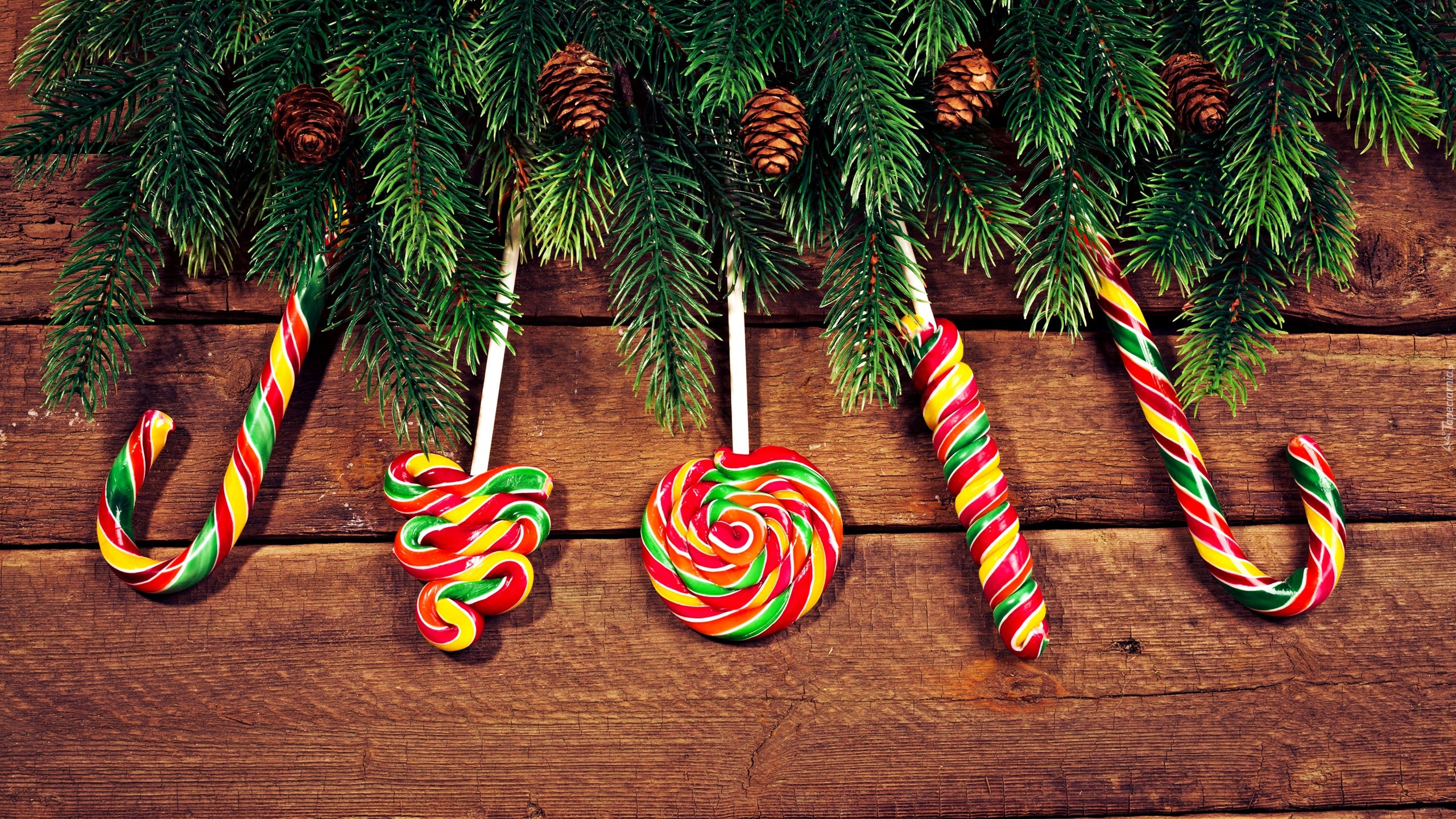 Edytor tapety: Lizaki i świerkowe gałązki na deskach
