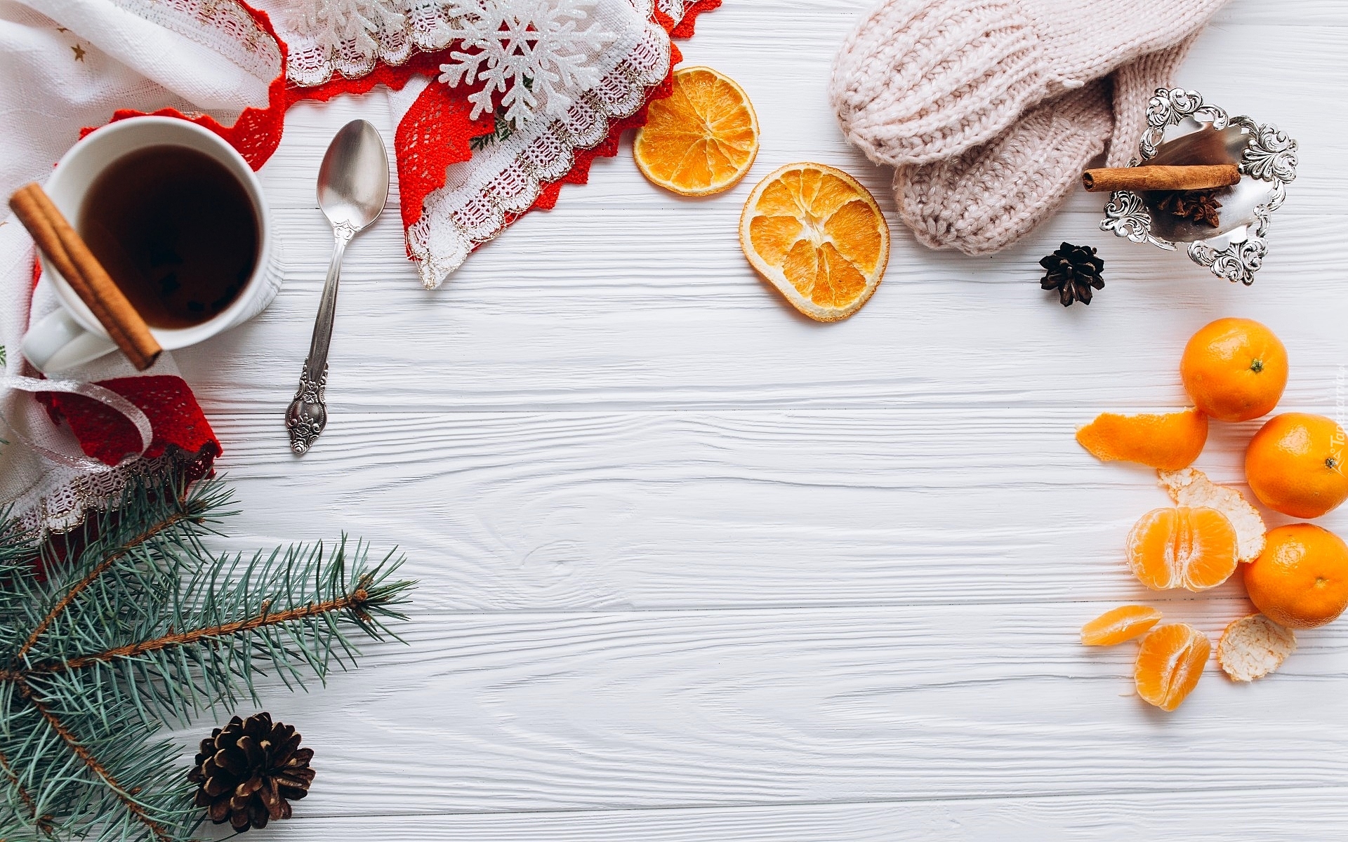 Edytor tapety: Herbata i rękawiczki obok gałązki świerkowej i mandarynek