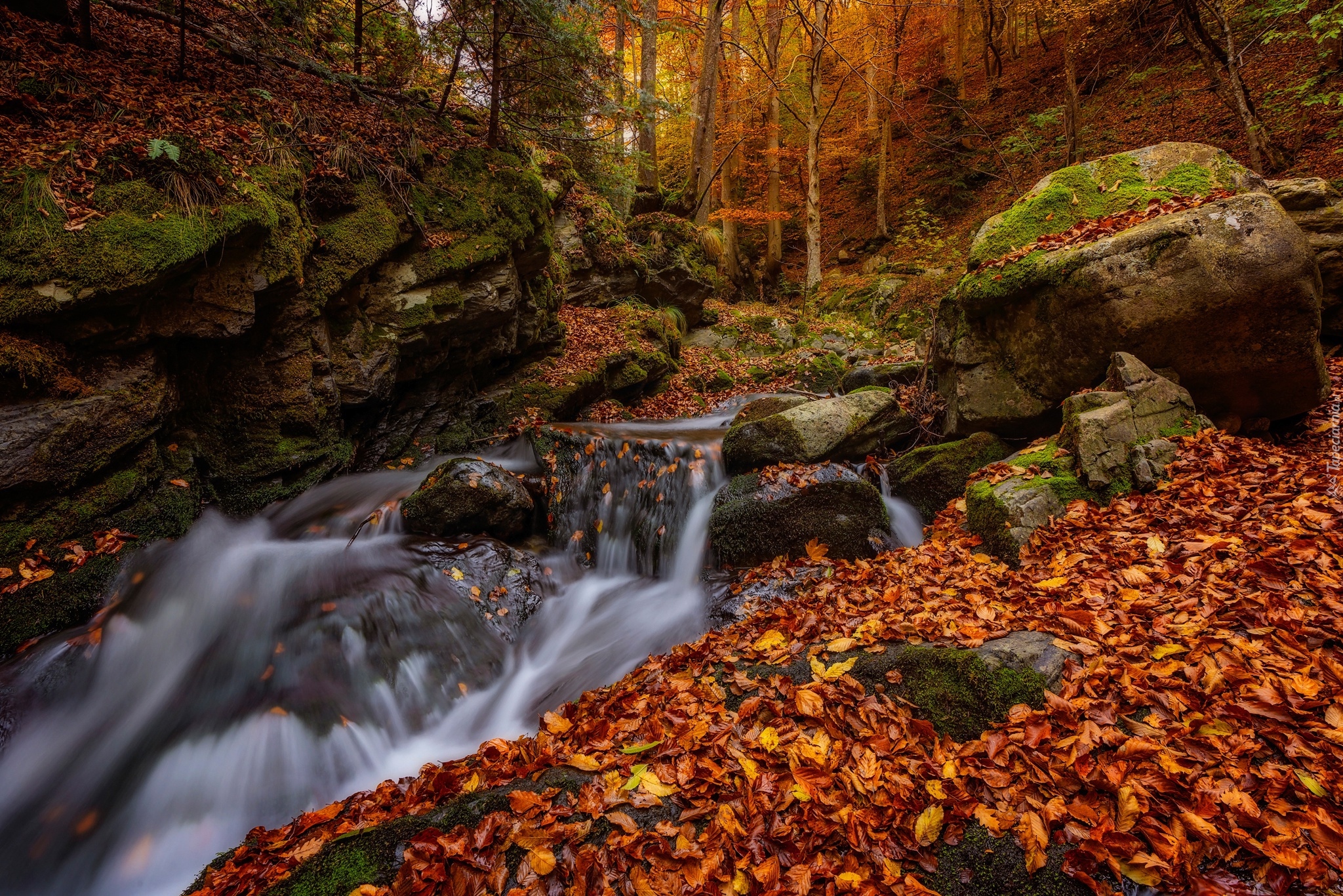Edytor tapety: Skały w rzece obsypane liśćmi