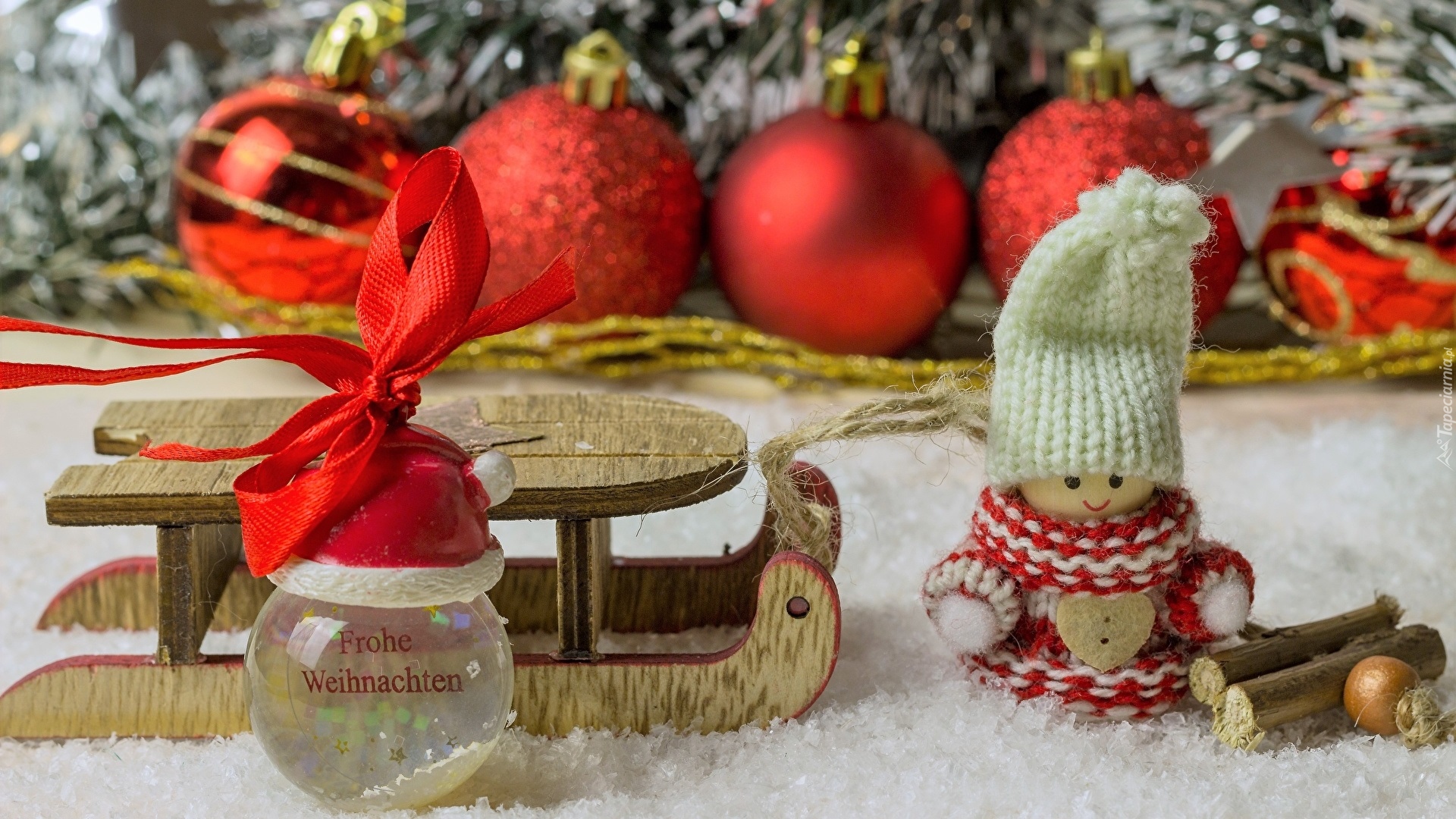 Edytor tapety: Laleczka w czapeczce obok sanek w dekoracji świątecznej