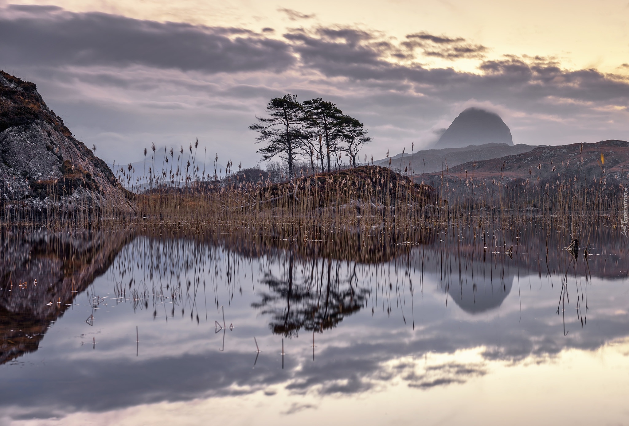 Edytor tapety: Drzewa nad jeziorem porośniętym szuwarami