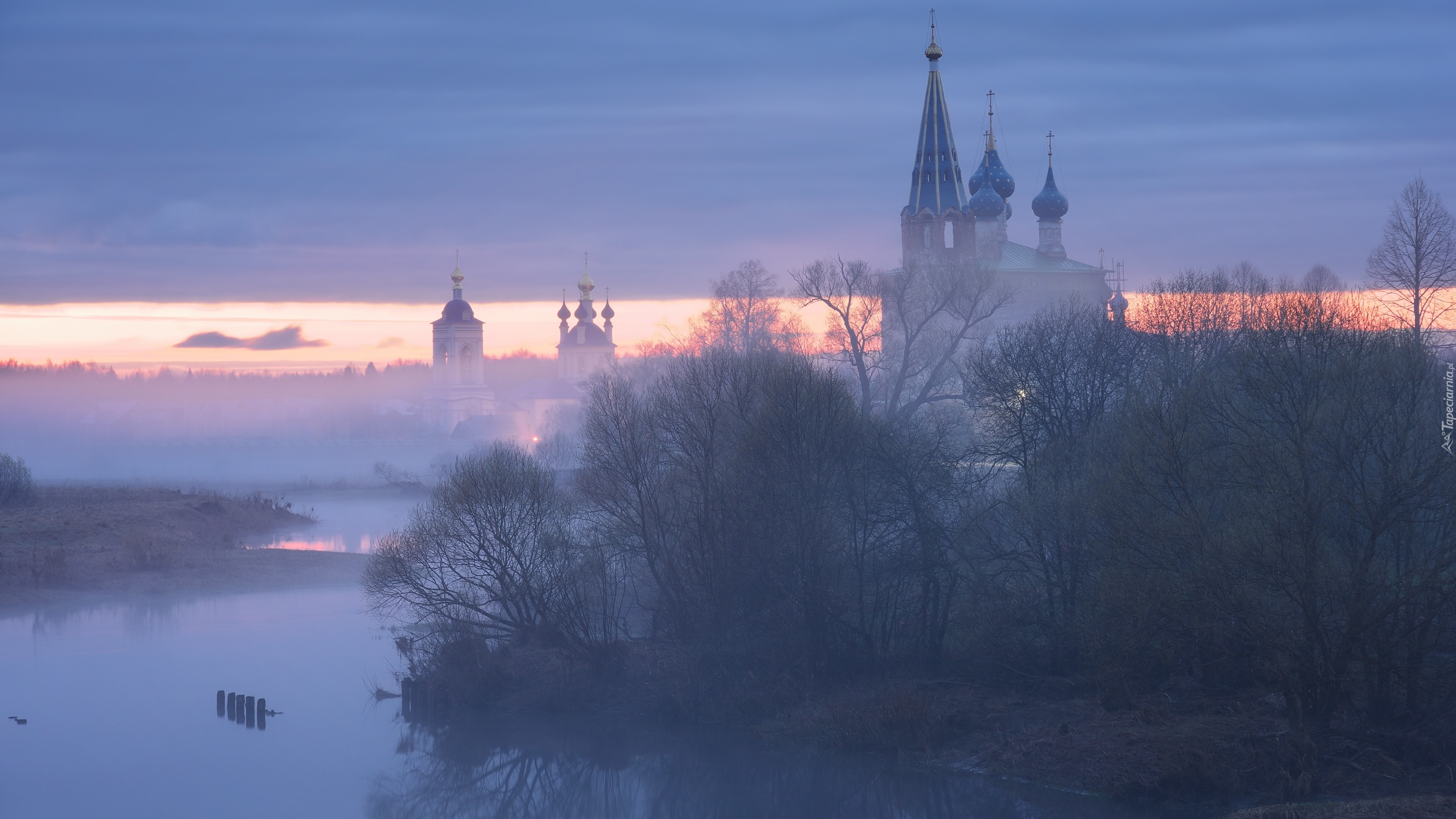 Edytor tapety: Zamglone cerkwie nad rzeką Tezą w Dunilovie