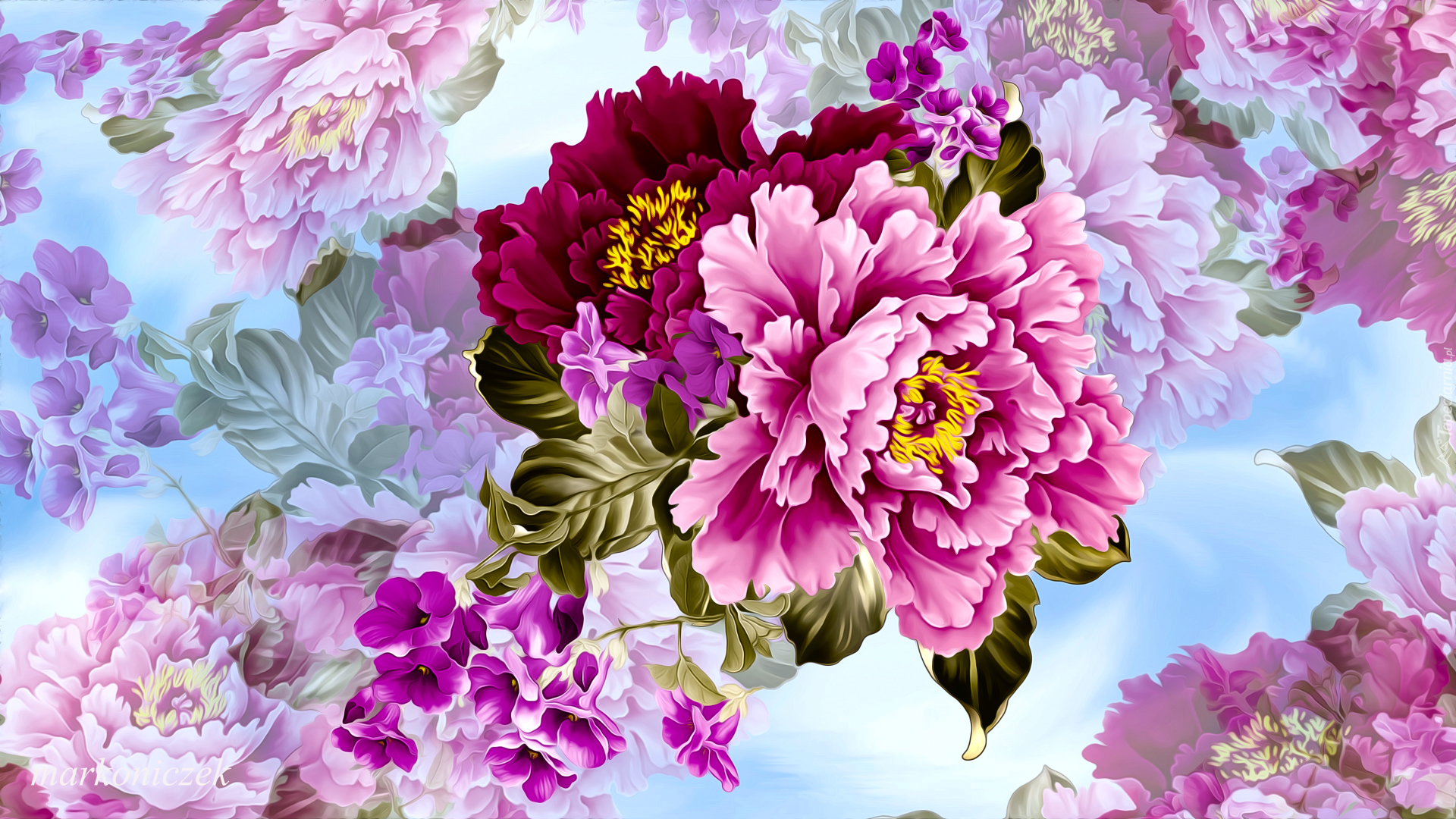 Edytor tapety: Różowe i bordowe kwiaty w grafice
