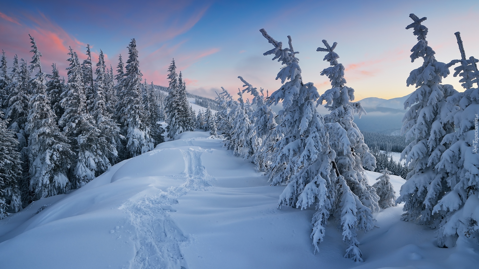 Edytor tapety: Wzgórza z ośnieżonymi świerkami