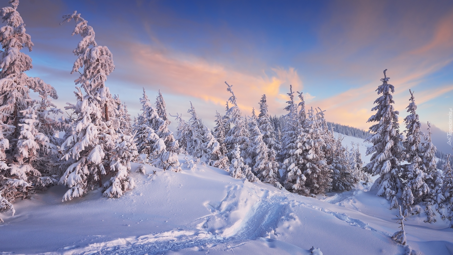 Edytor tapety: Ośnieżone świerki na szczytach gór