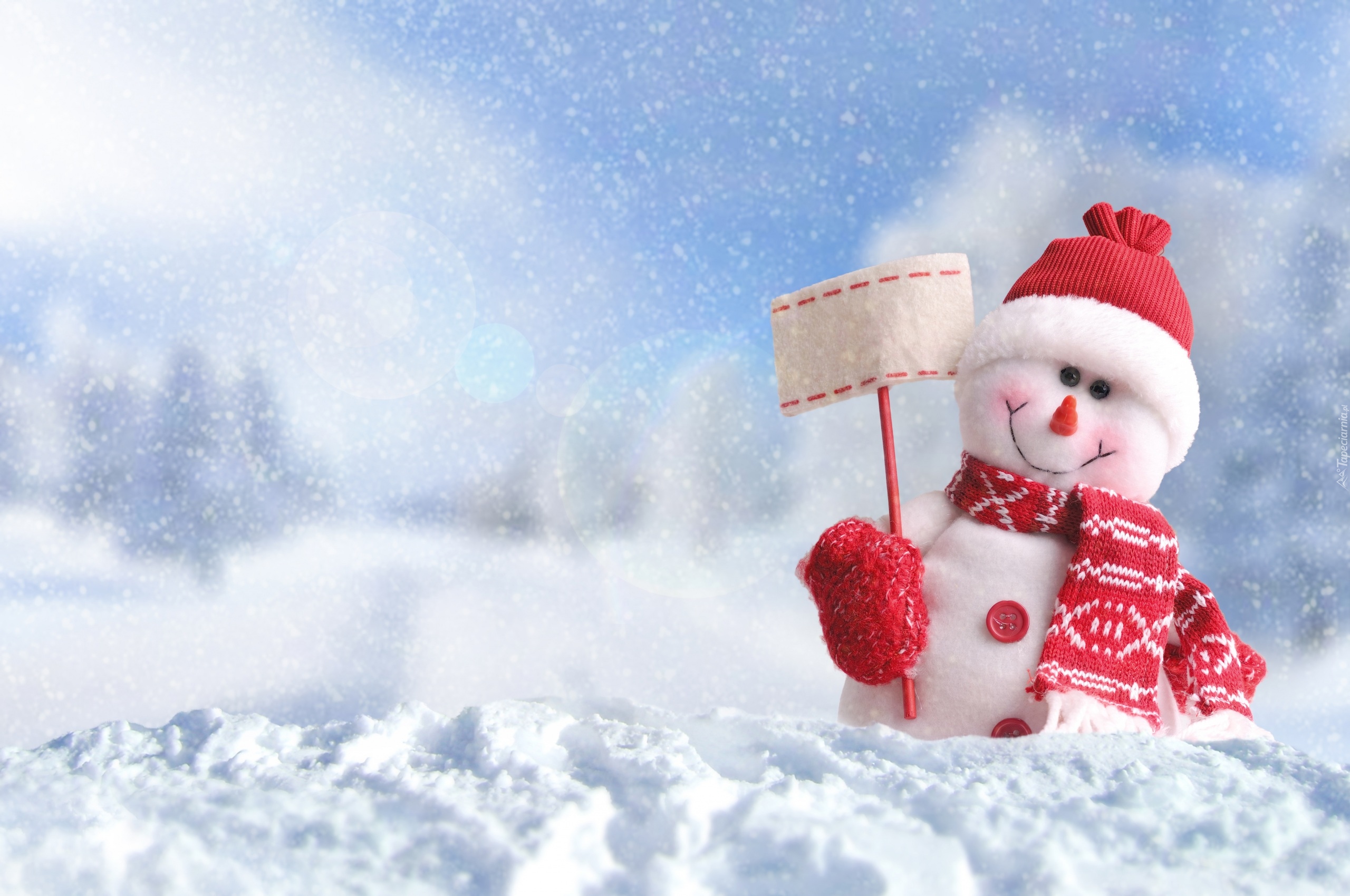 Edytor tapety: Bałwanek w czapeczce i szaliku na śniegu