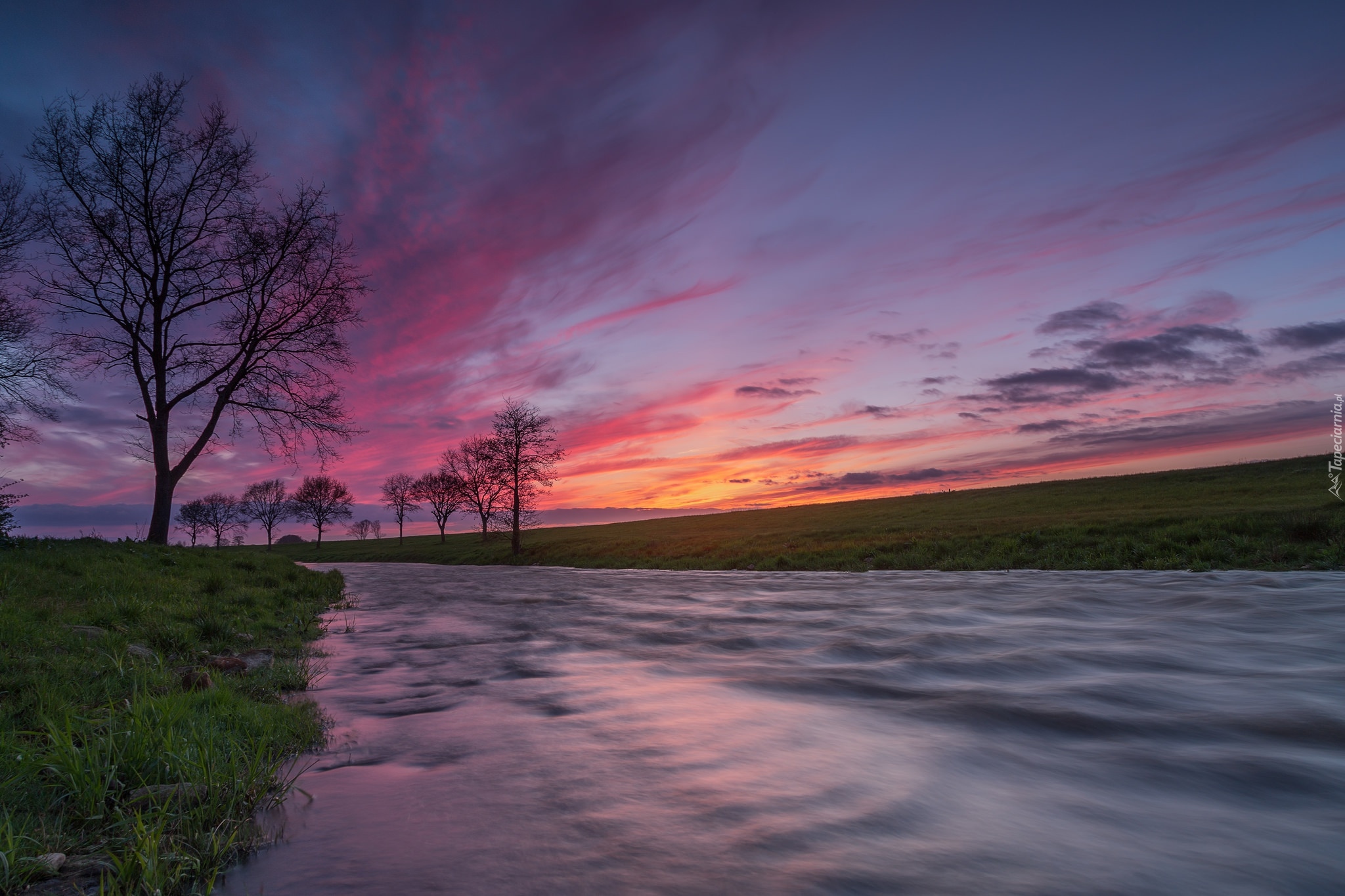 Edytor tapety: Drzewa wzdłuż rzeki o zachodzie słońca