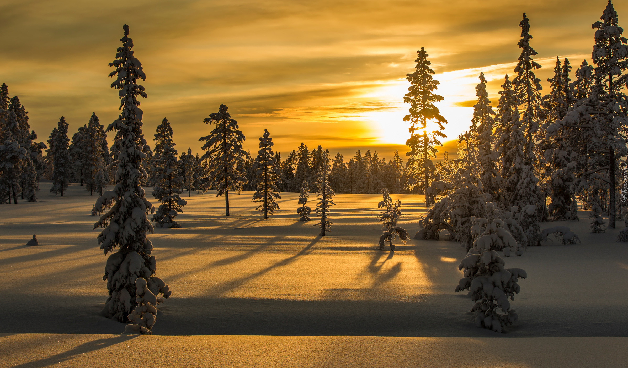 Edytor tapety: Zaśnieżone drzewa na tle zachodu słońca