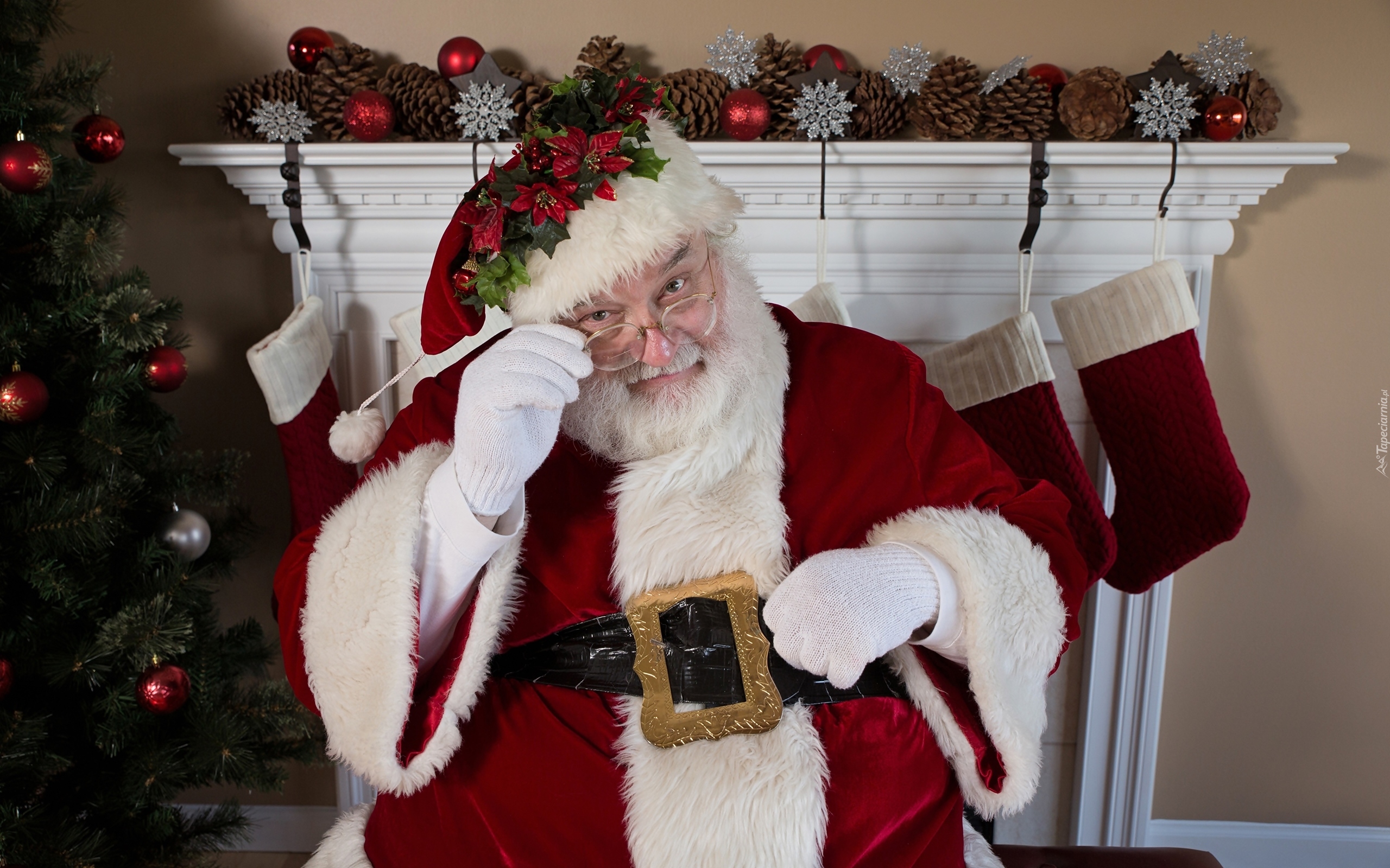 Edytor tapety: Mikołaj przy ozdobionym kominku