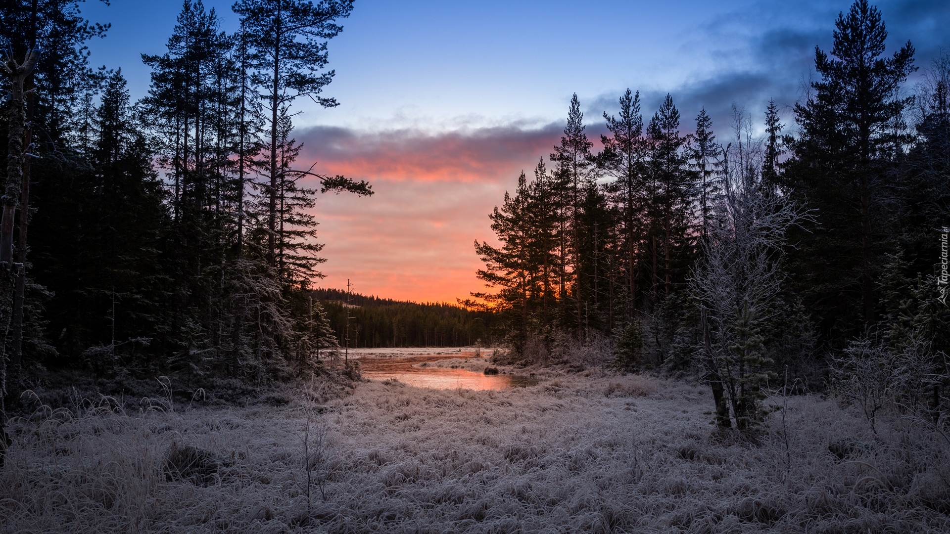 Edytor tapety: Oszronione trawy i drzewa w zachodzącym słońcu