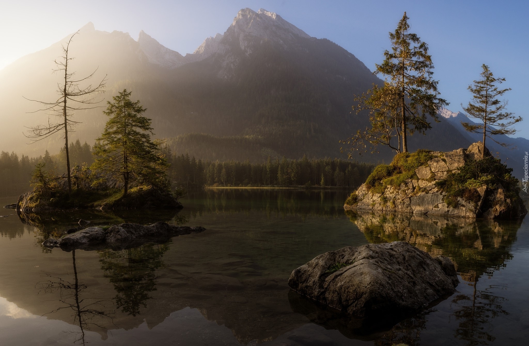 Edytor tapety: Drzewa i skały na jeziorze Hintersee w Bawarii
