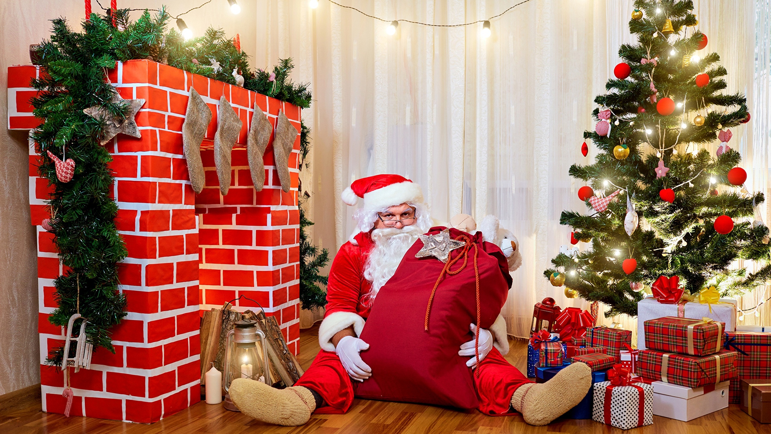 Edytor tapety: Mikołaj z prezentami obok kominka
