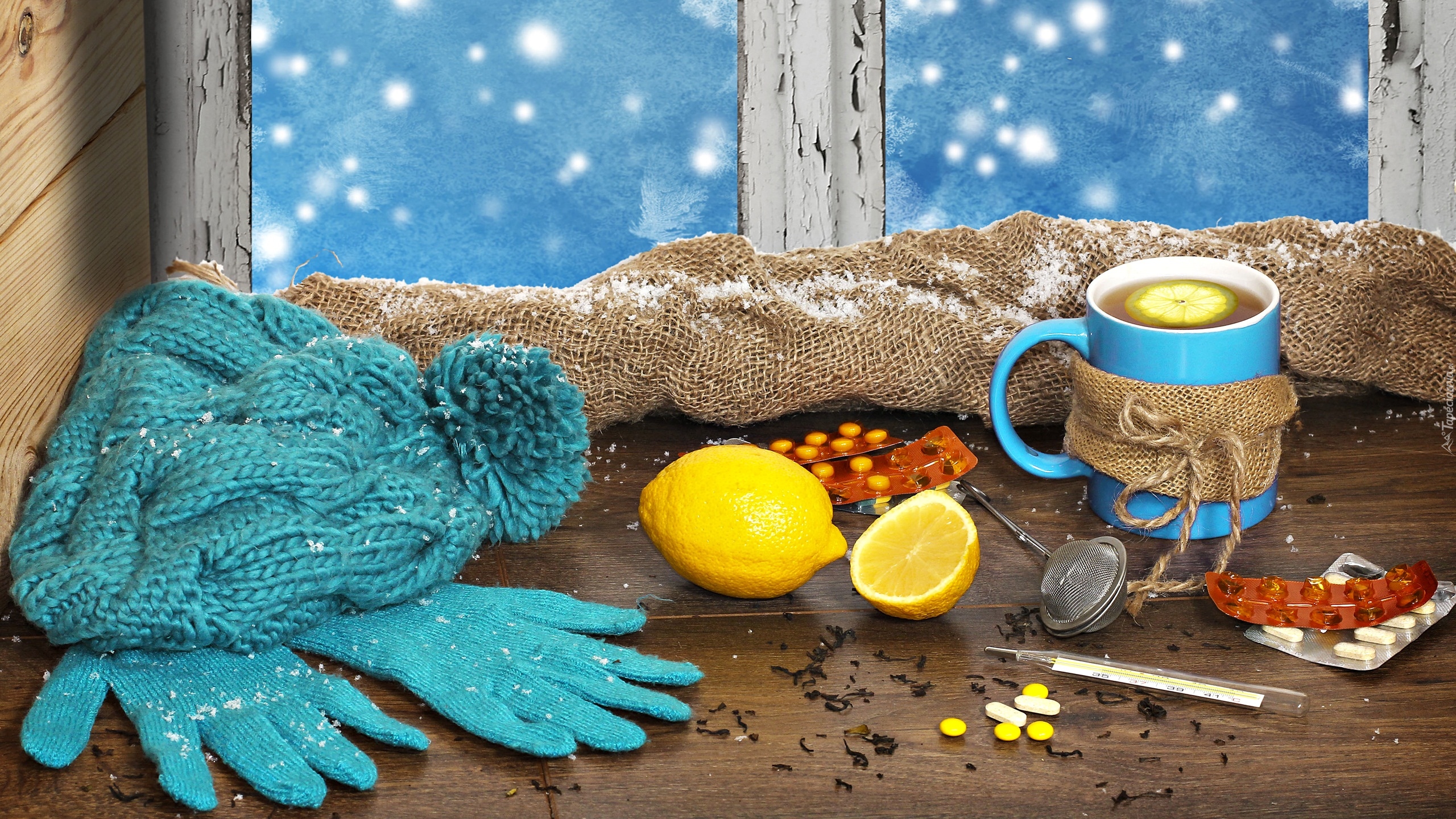 Edytor tapety: Czapka i rękawiczki obok kubka herbaty z cytryną