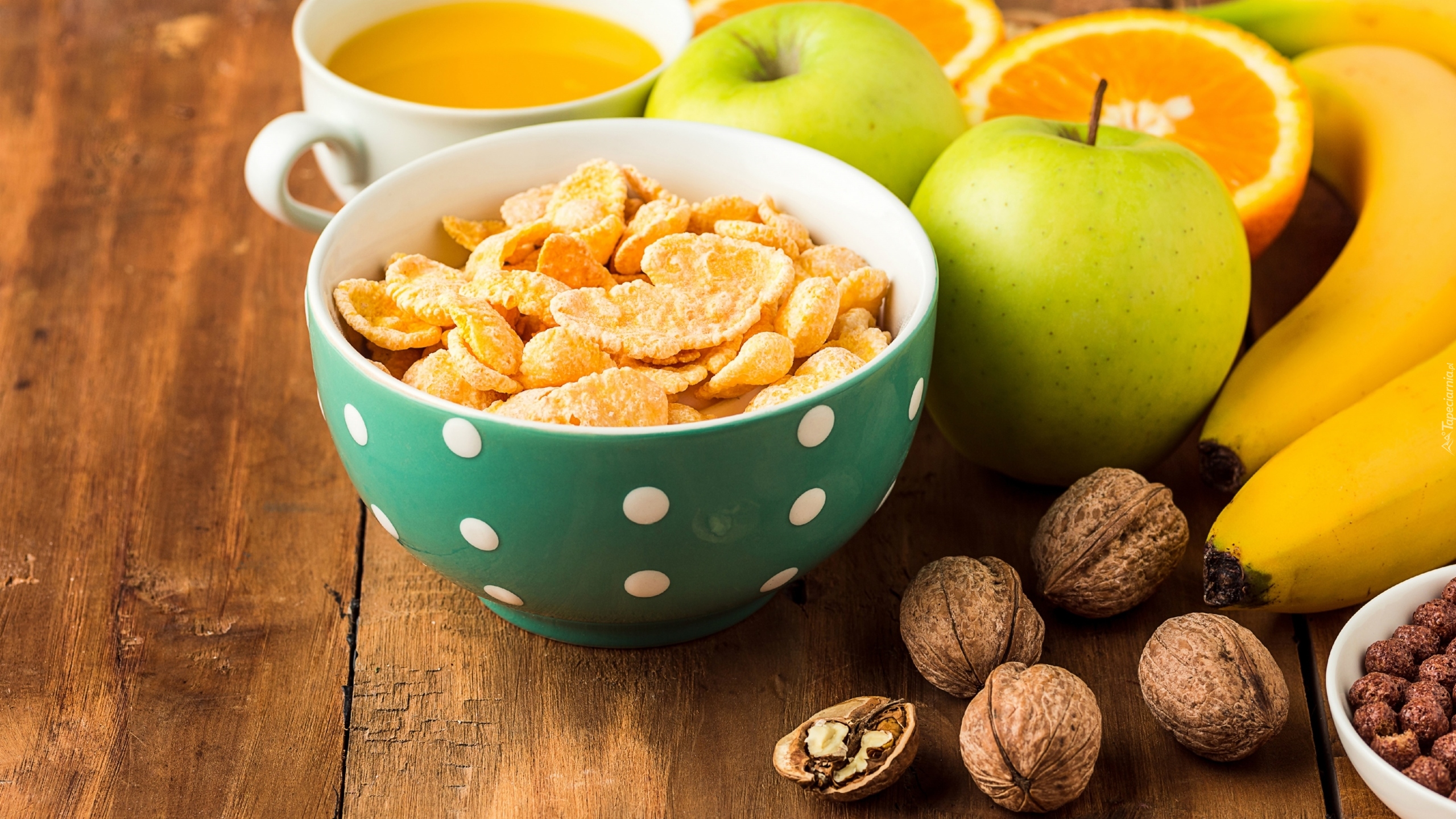 Edytor tapety: Płatki w zielonej miseczce obok jabłek i orzechów