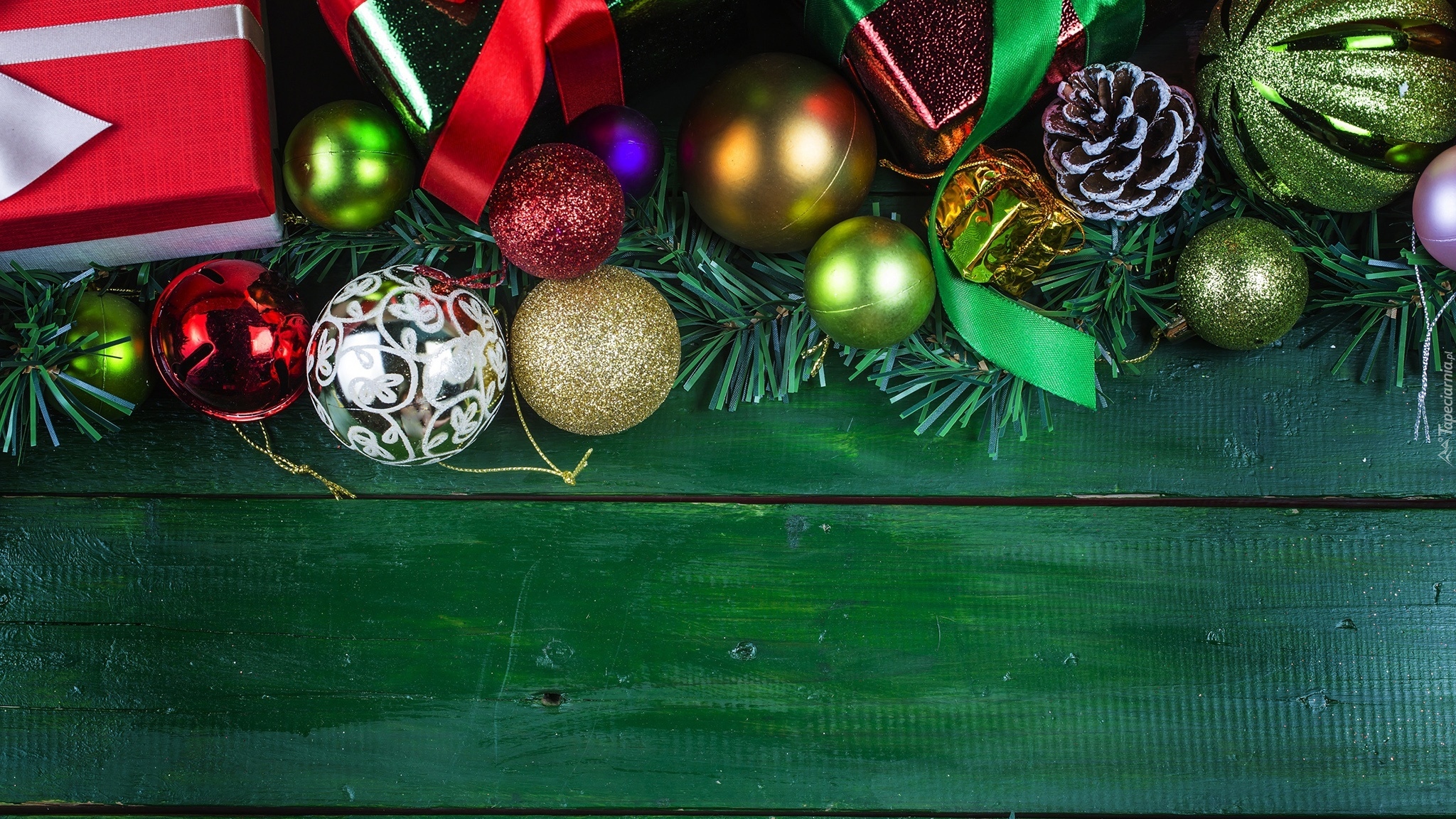 Edytor tapety: Prezenty i bombki na zielonych deskach