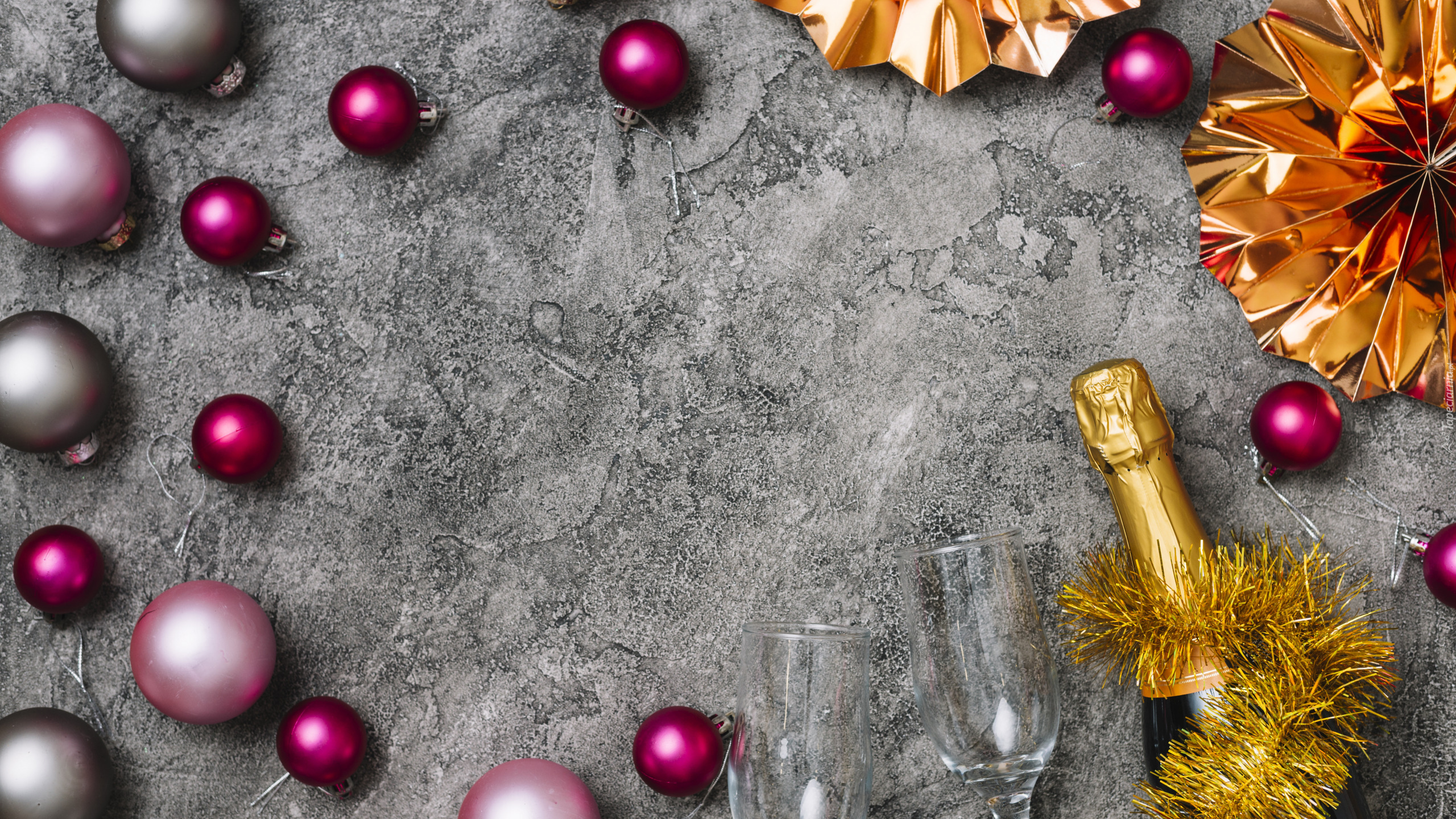Edytor tapety: Różowe bombki obok butelki szampana i kieliszków