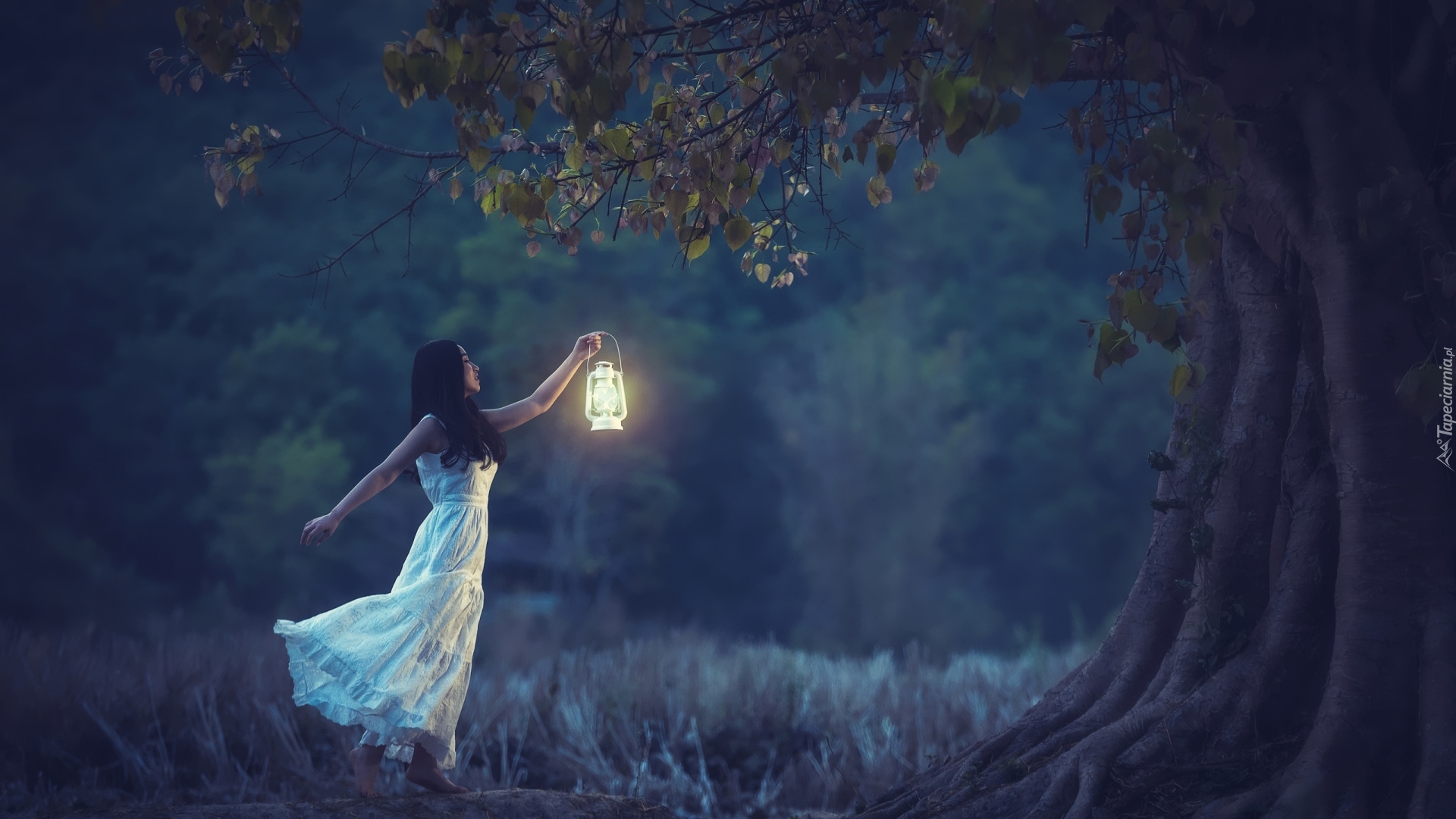 Edytor tapety: Dziewczyna z lampionem obok drzewa