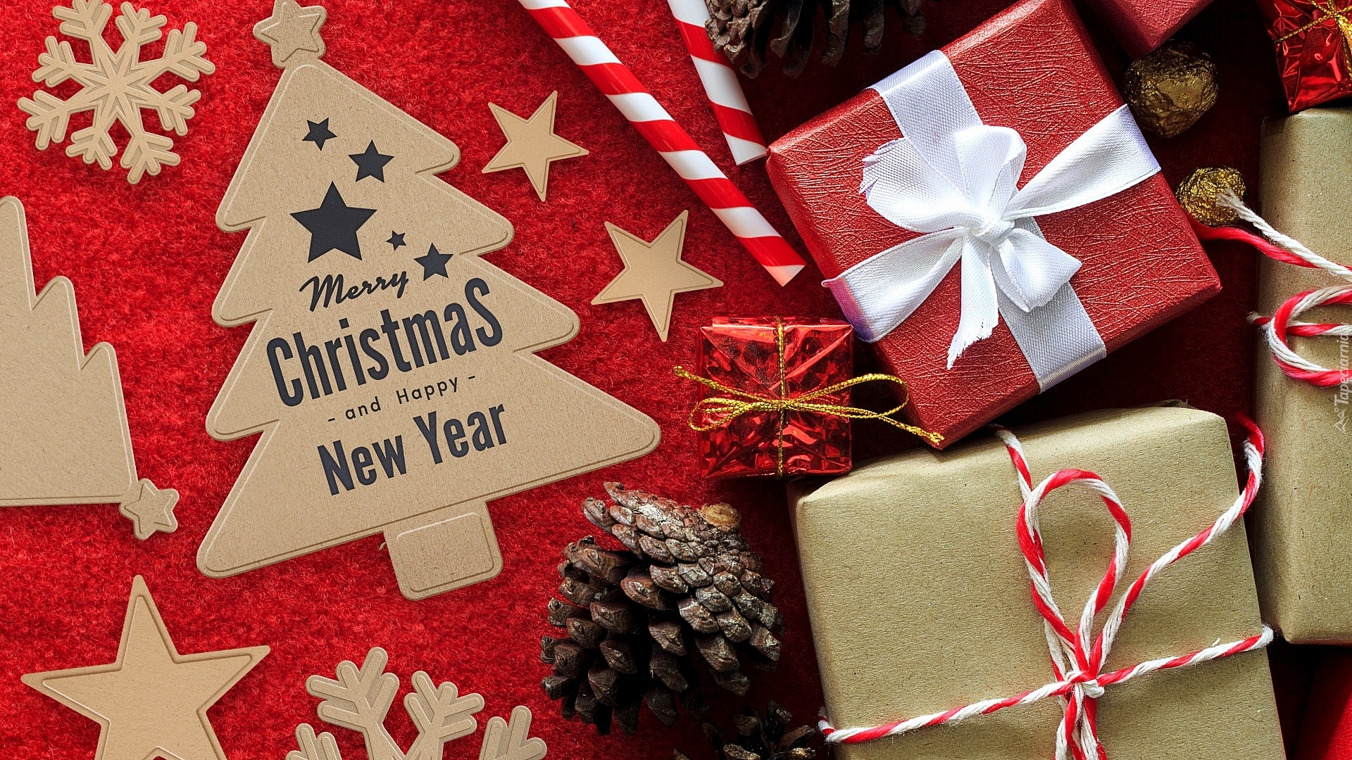 Edytor tapety: Prezenty obok tekturowej choinki