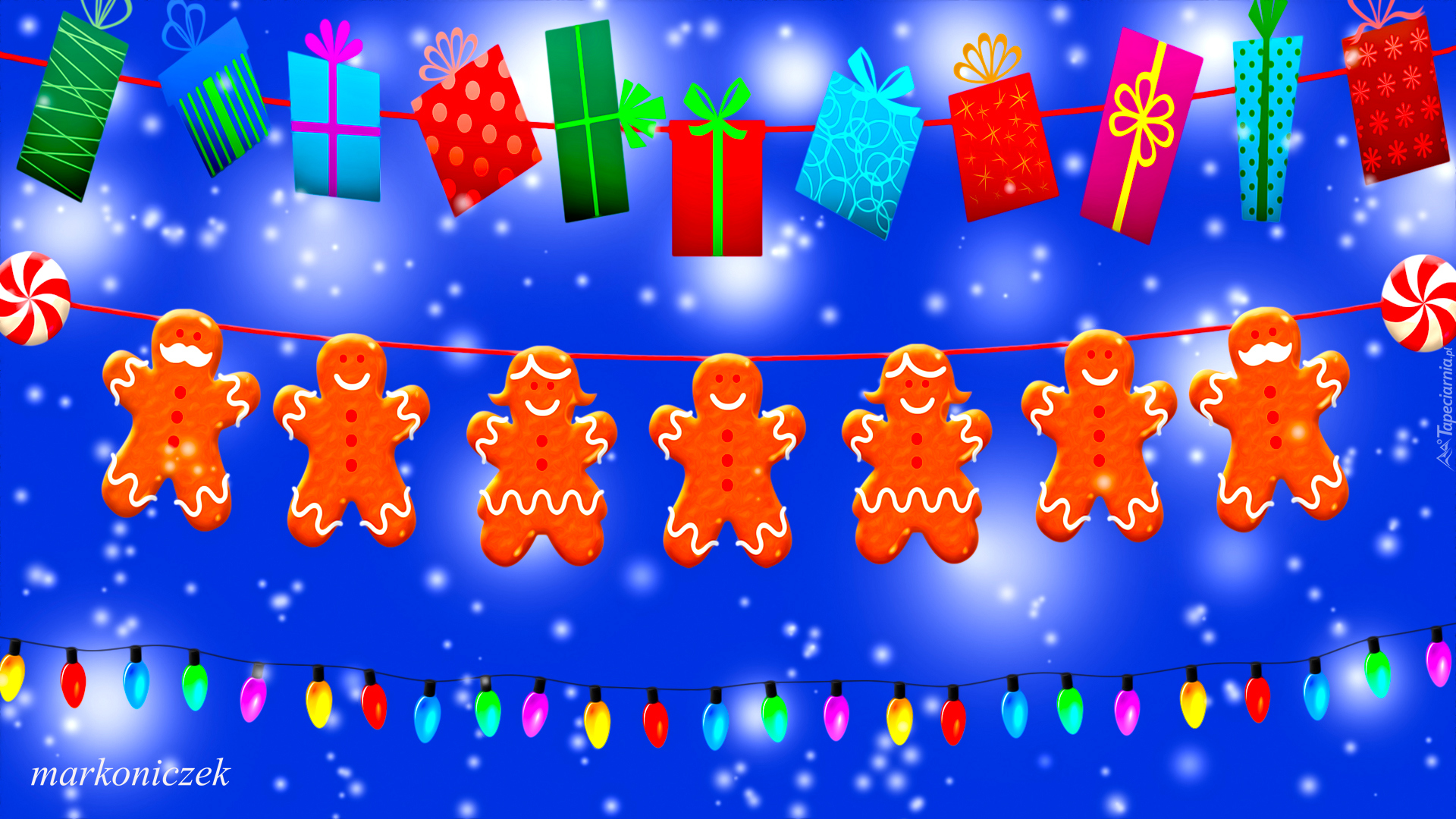 Edytor tapety: Wiszące prezenty ze światełkami i piernikami
