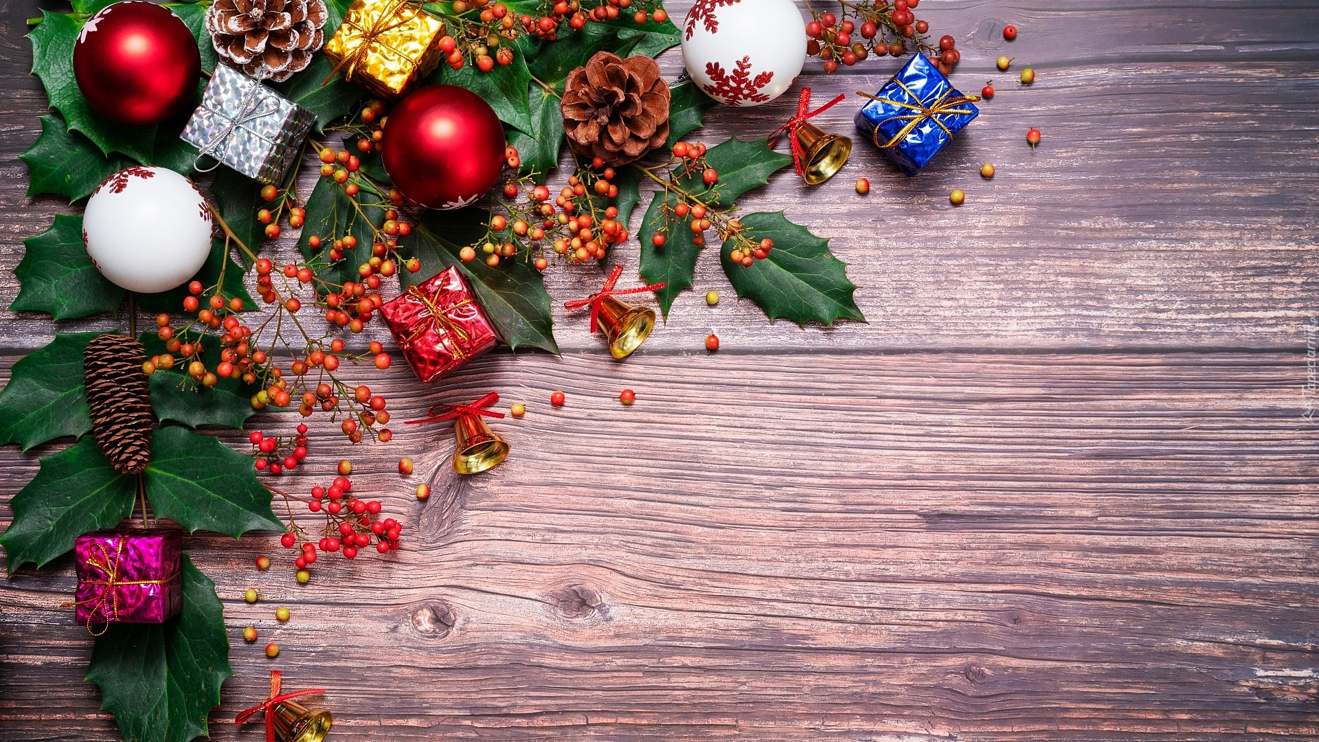 Edytor tapety: Bombki i dekoracyjne prezenciki w kompozycji świątecznej