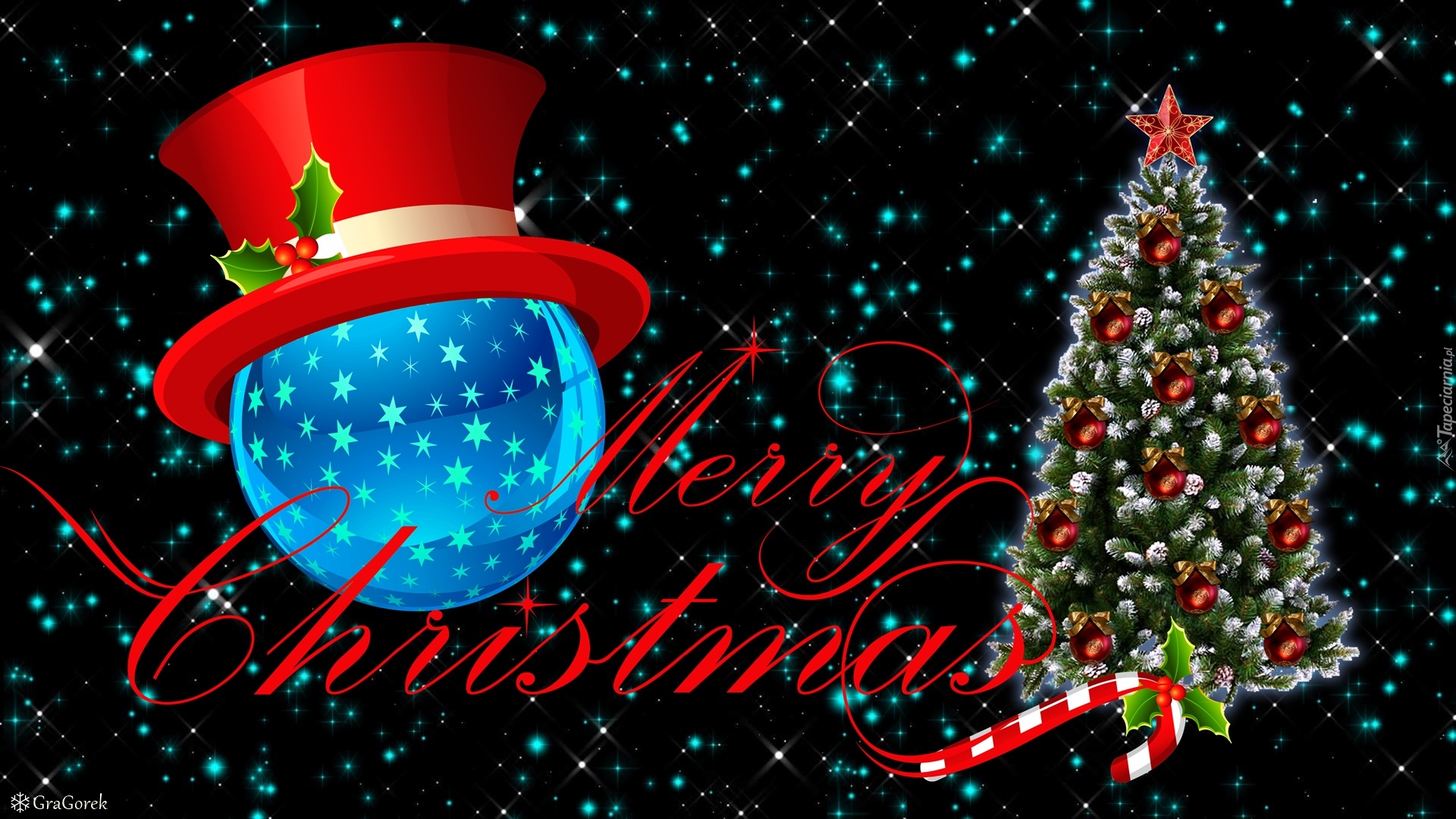 Edytor tapety: Kapelusz na kuli obok choinki