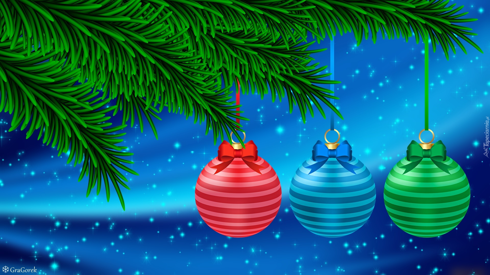 Edytor tapety: Trzy wiszące bombki na gałązkach świerkowych